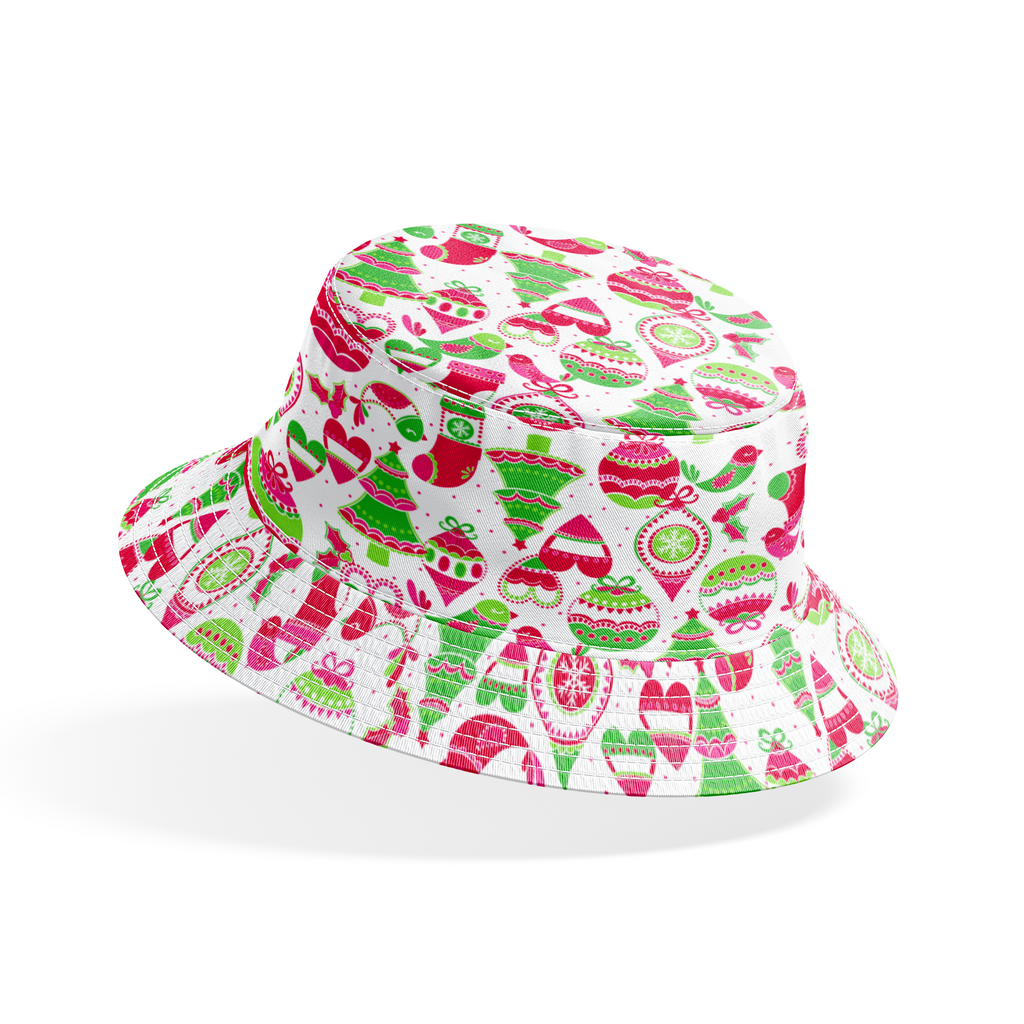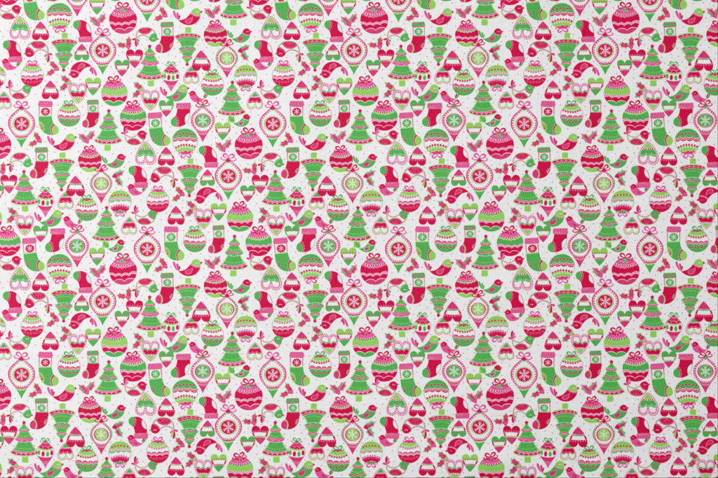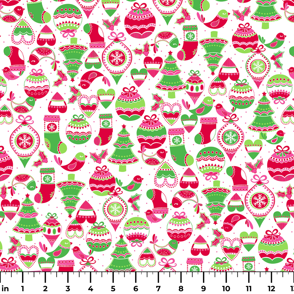 Festive Christmas pattern with vibrant pink and green ornaments, stockings, trees, and birds on a white background - perfect for holiday crafting and seasonal decor.