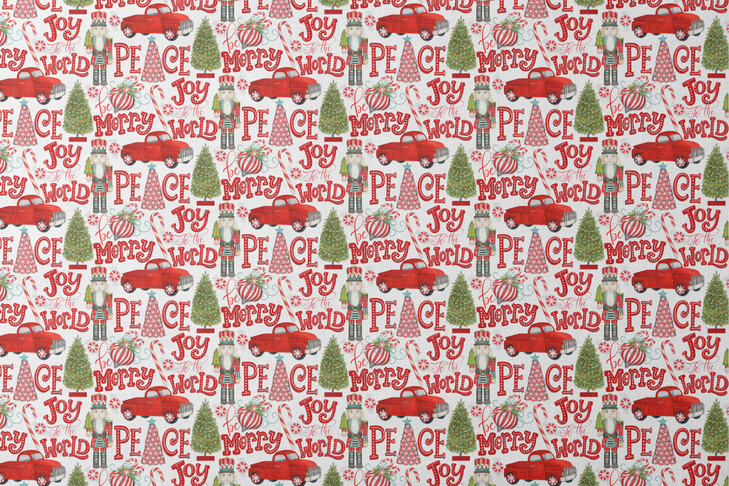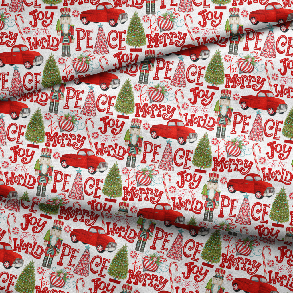 A playful holiday fabric design featuring nutcrackers, candy canes, red trucks, and festive lettering in bold red and green tones by Nicole Tamarin. Use this print in Christmas quilts, festive DIY decor and handmade holiday gifts.