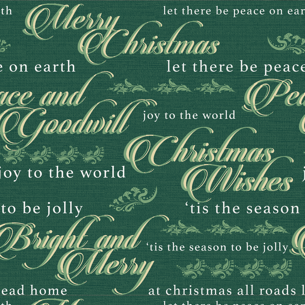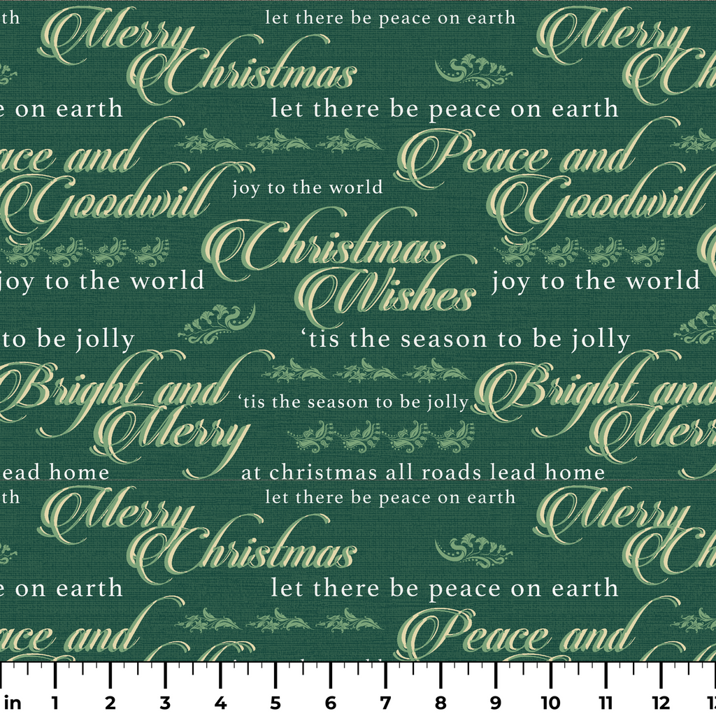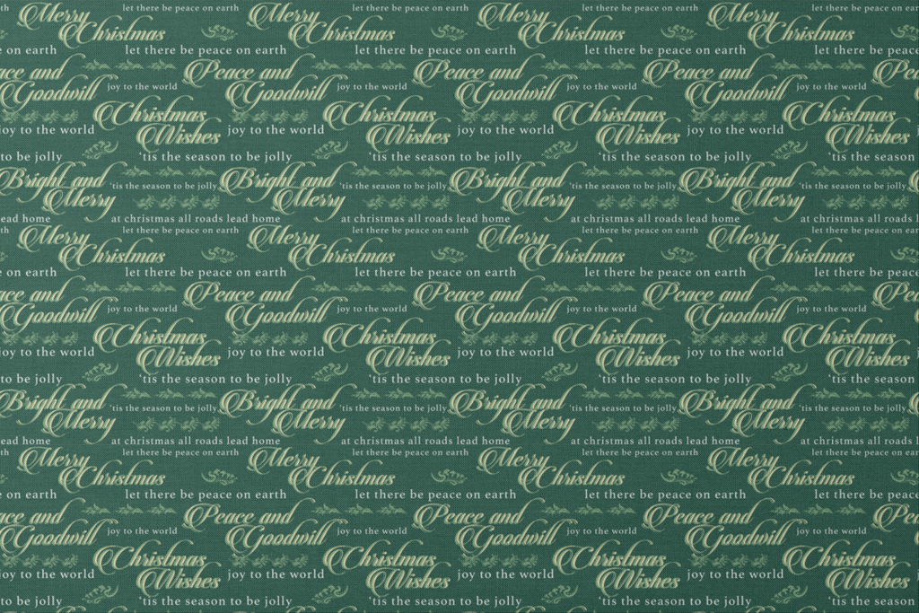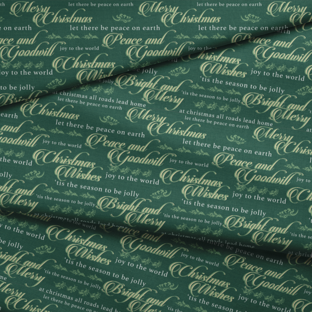 This rich green fabric with elegant cream script features traditional Christmas phrases like "Merry Christmas," "Peace and Goodwill," and "joy to the world" in a classic holiday design perfect for seasonal decor.