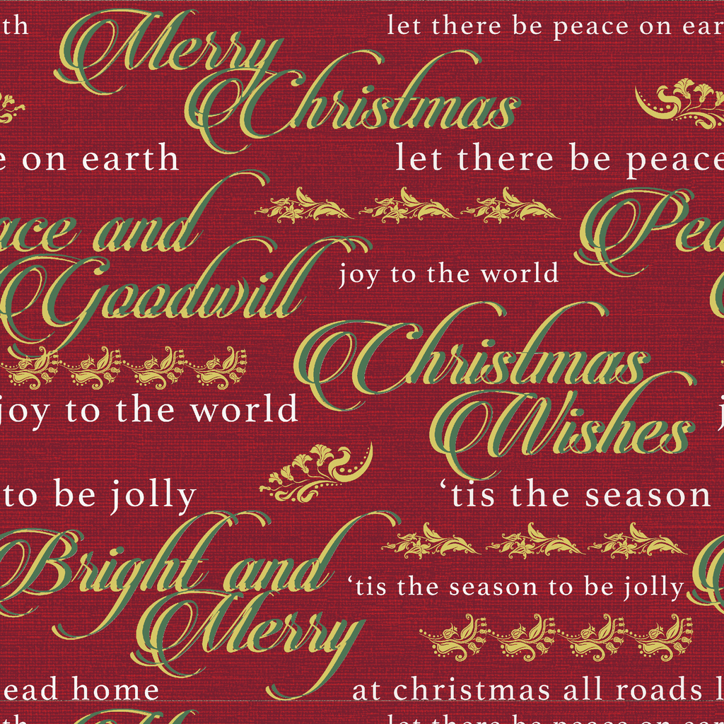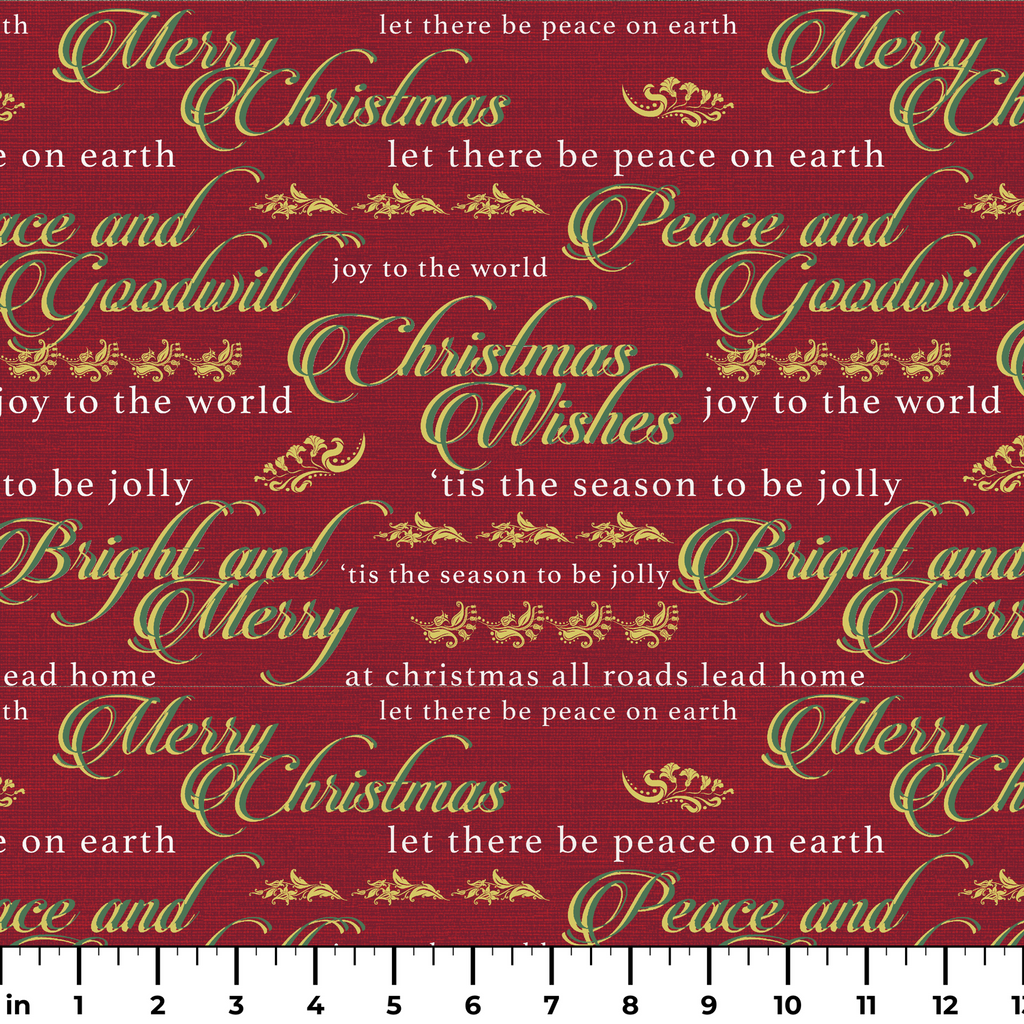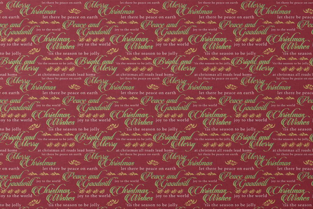 This rich red fabric with elegant gold script features traditional Christmas phrases like "Merry Christmas," "Peace and Goodwill," and "joy to the world" in a classic holiday design perfect for seasonal decor.