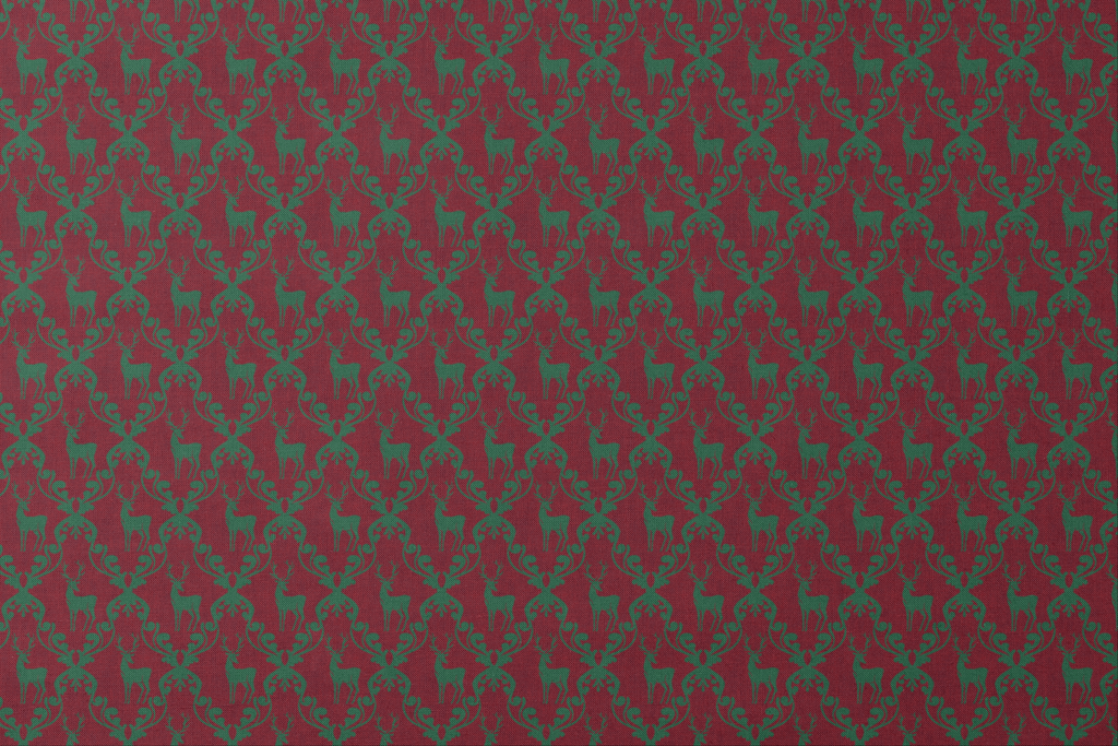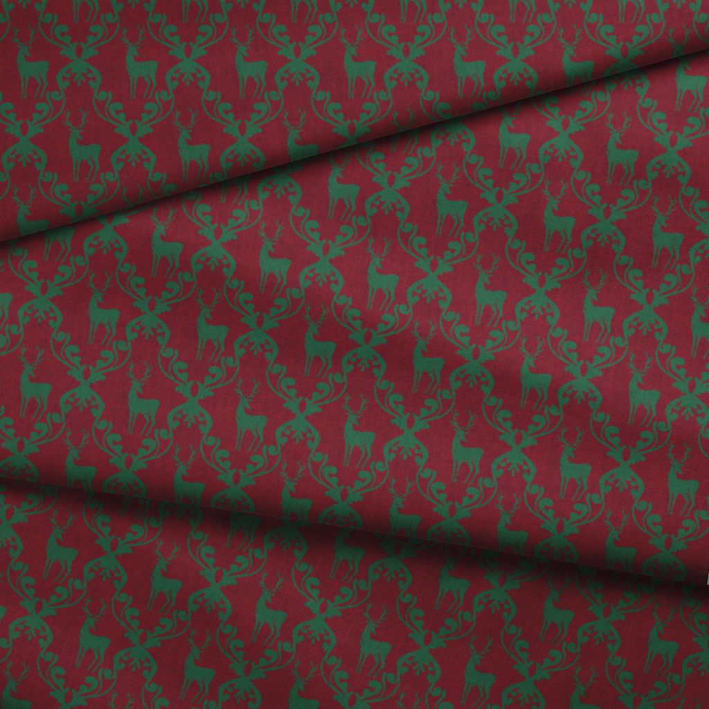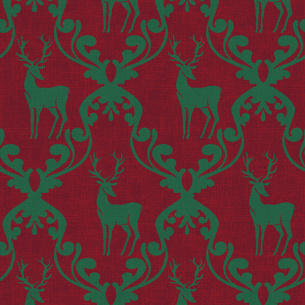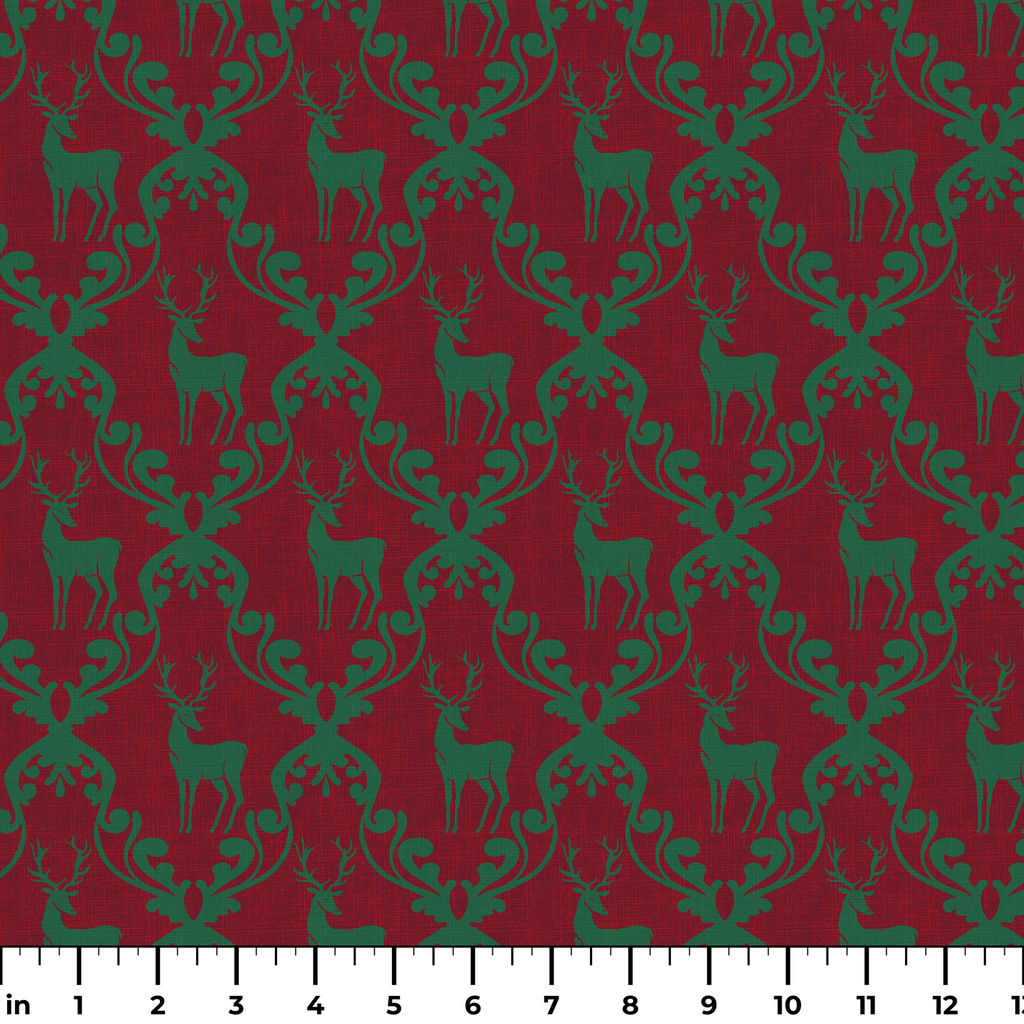 Elegant stag and damask pattern in green and red creates a traditional holiday woodland aesthetic for home decor or upholstery. Perfect for heritage-inspired lodge or cabin styling for the winter season.