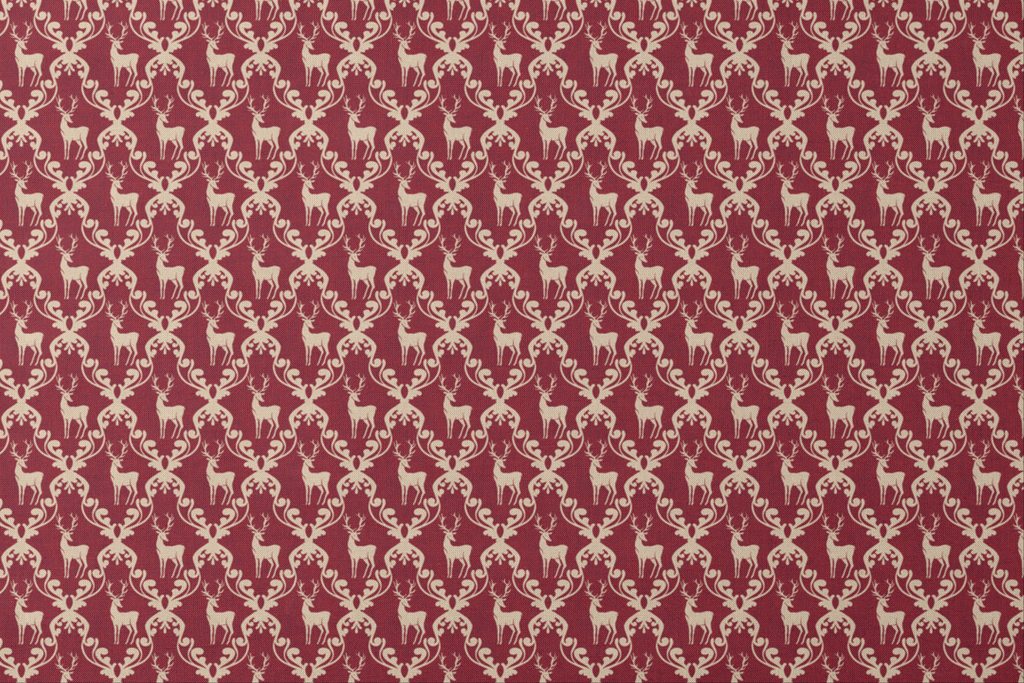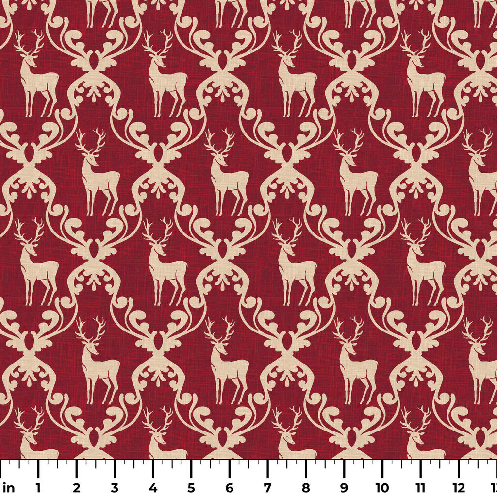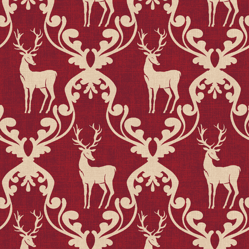 Elegant stag and damask pattern in red and cream creates a traditional holiday woodland aesthetic for home decor or upholstery. Perfect for heritage-inspired lodge or cabin styling for the winter season.