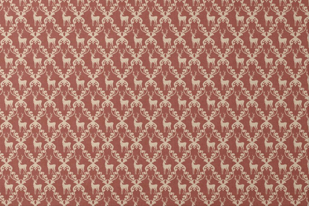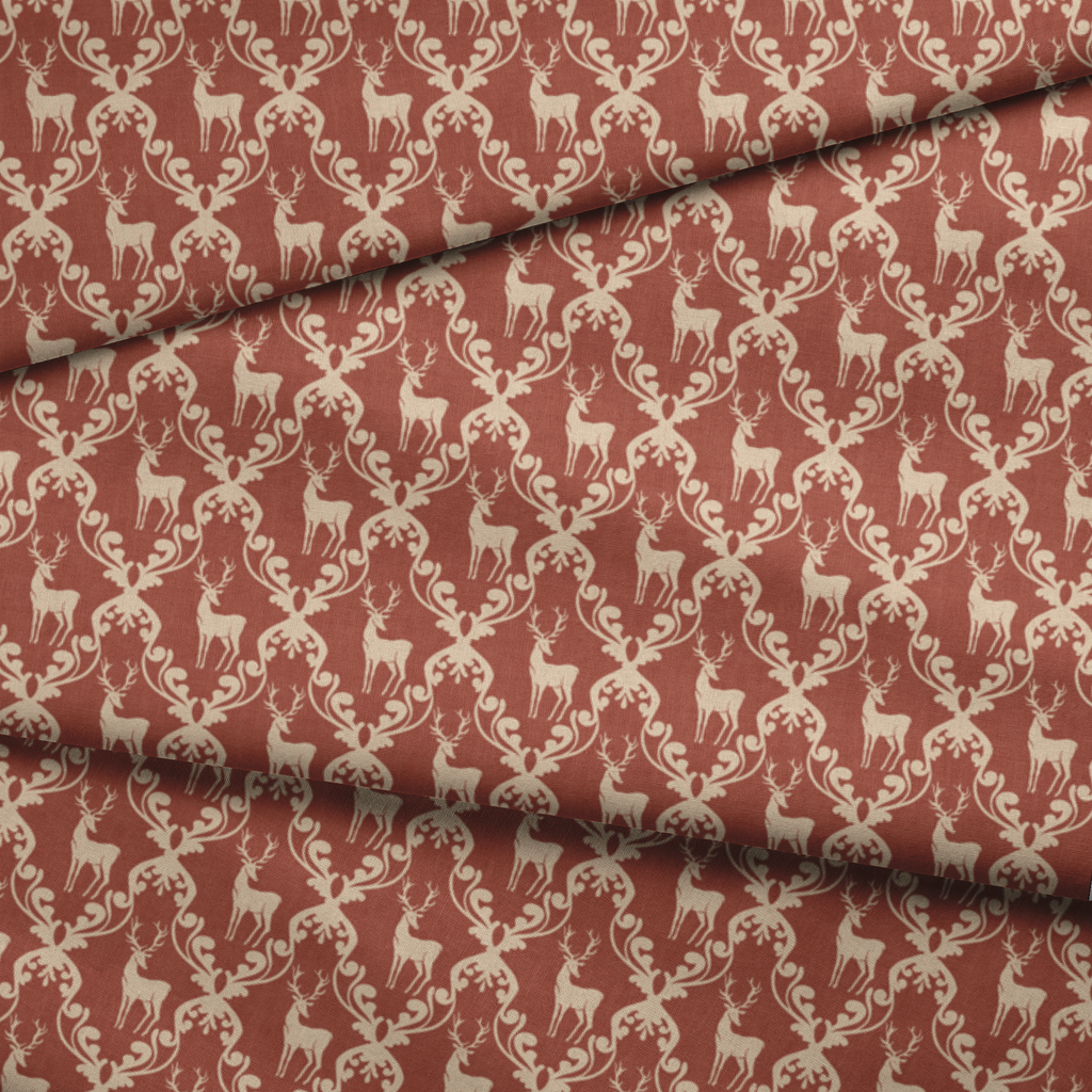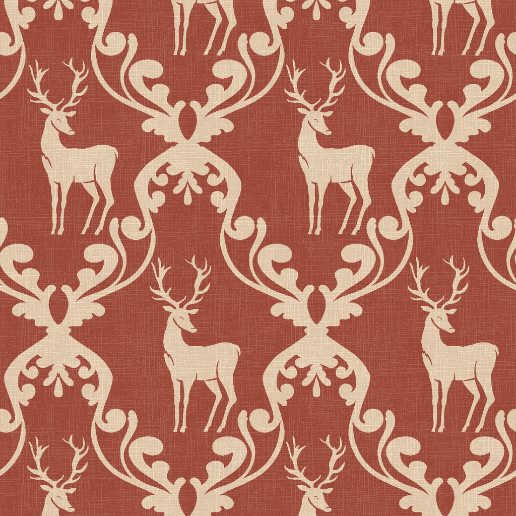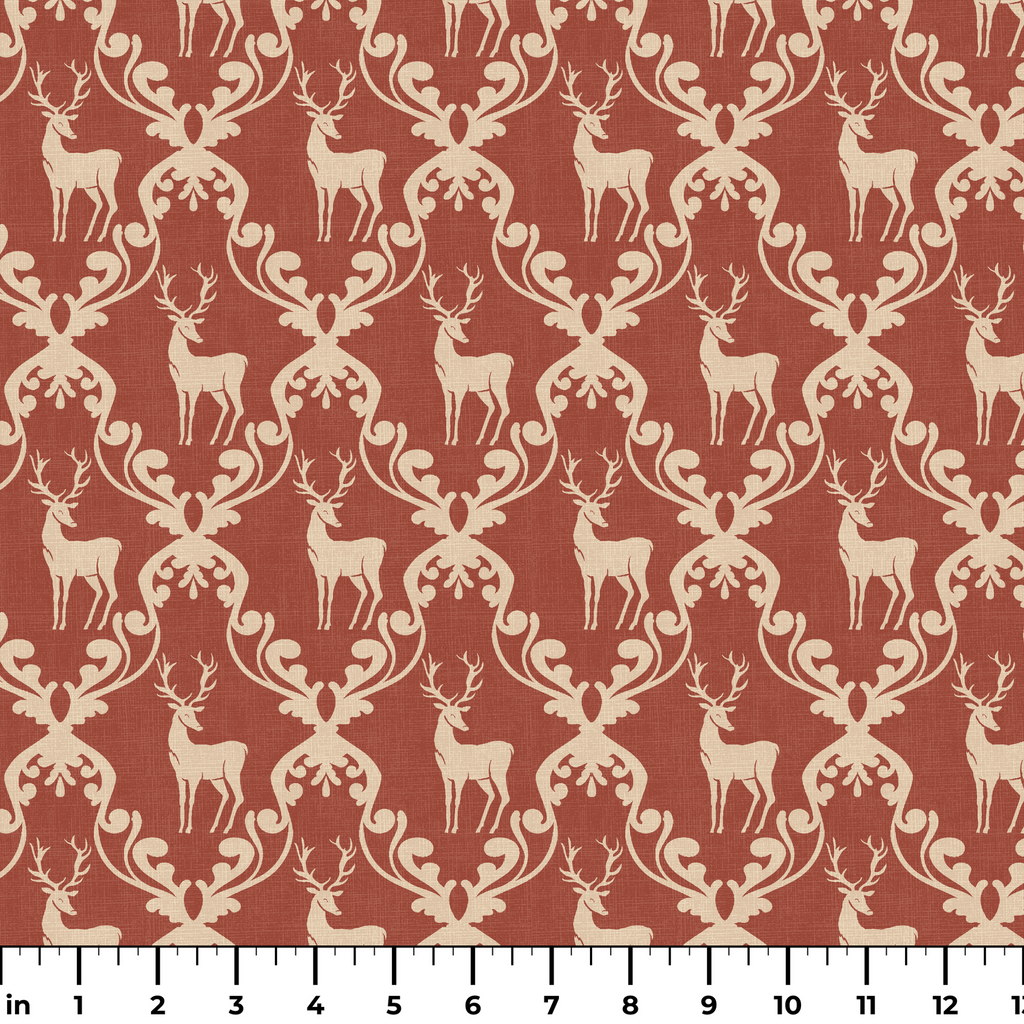 Elegant stag and damask pattern in rust and cream creates a traditional holiday woodland aesthetic for home decor or upholstery. Perfect for heritage-inspired lodge or cabin styling for the winter season.