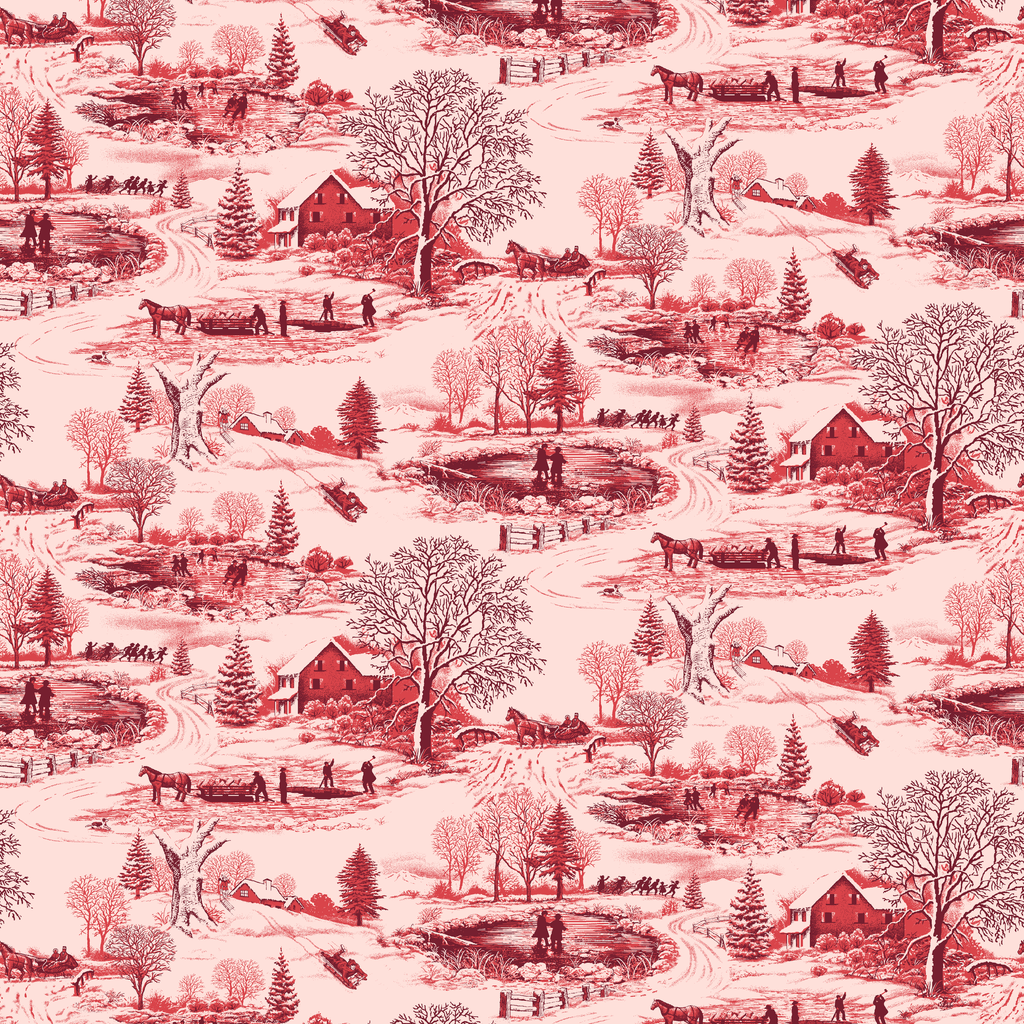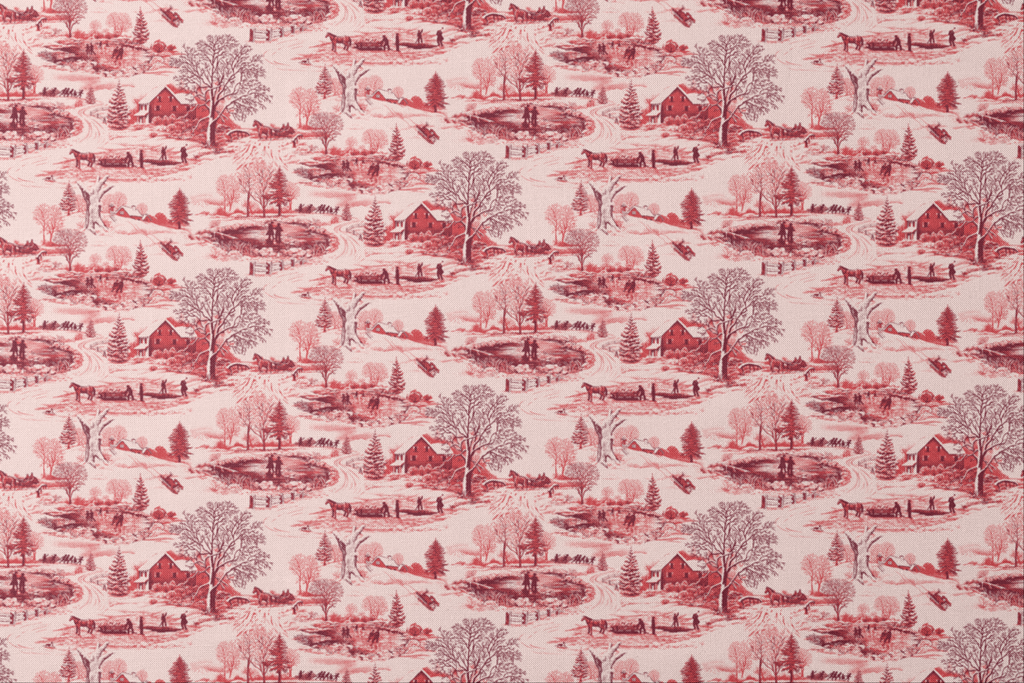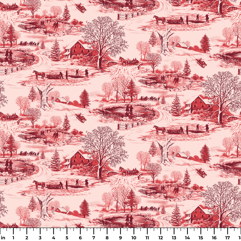 This scenic winter fabric showcases a charming traditional pattern with berry snow-covered landscapes, rustic houses, and evergreen trees, perfect for holiday quilting or seasonal home decor projects.