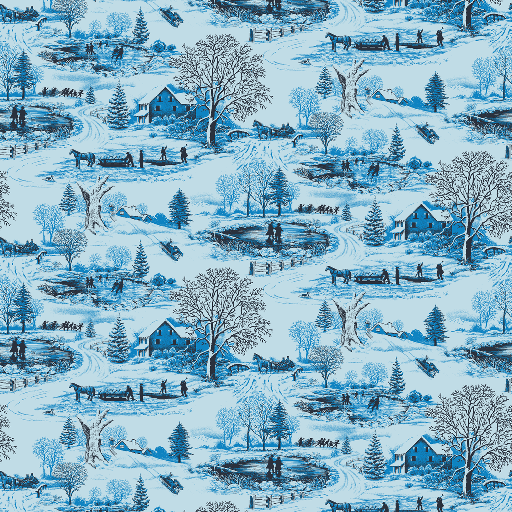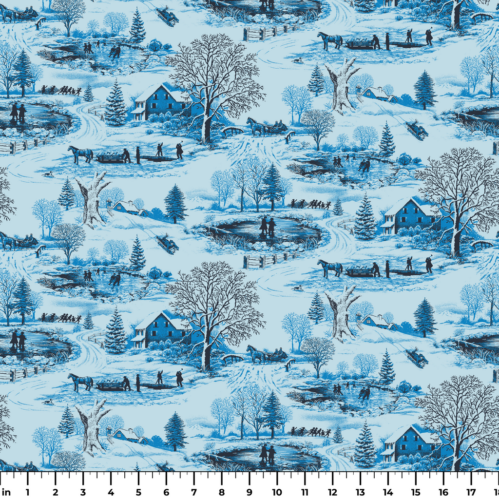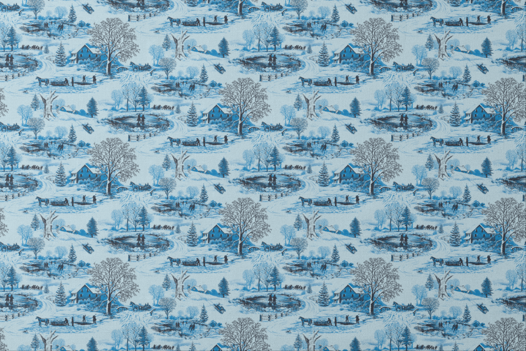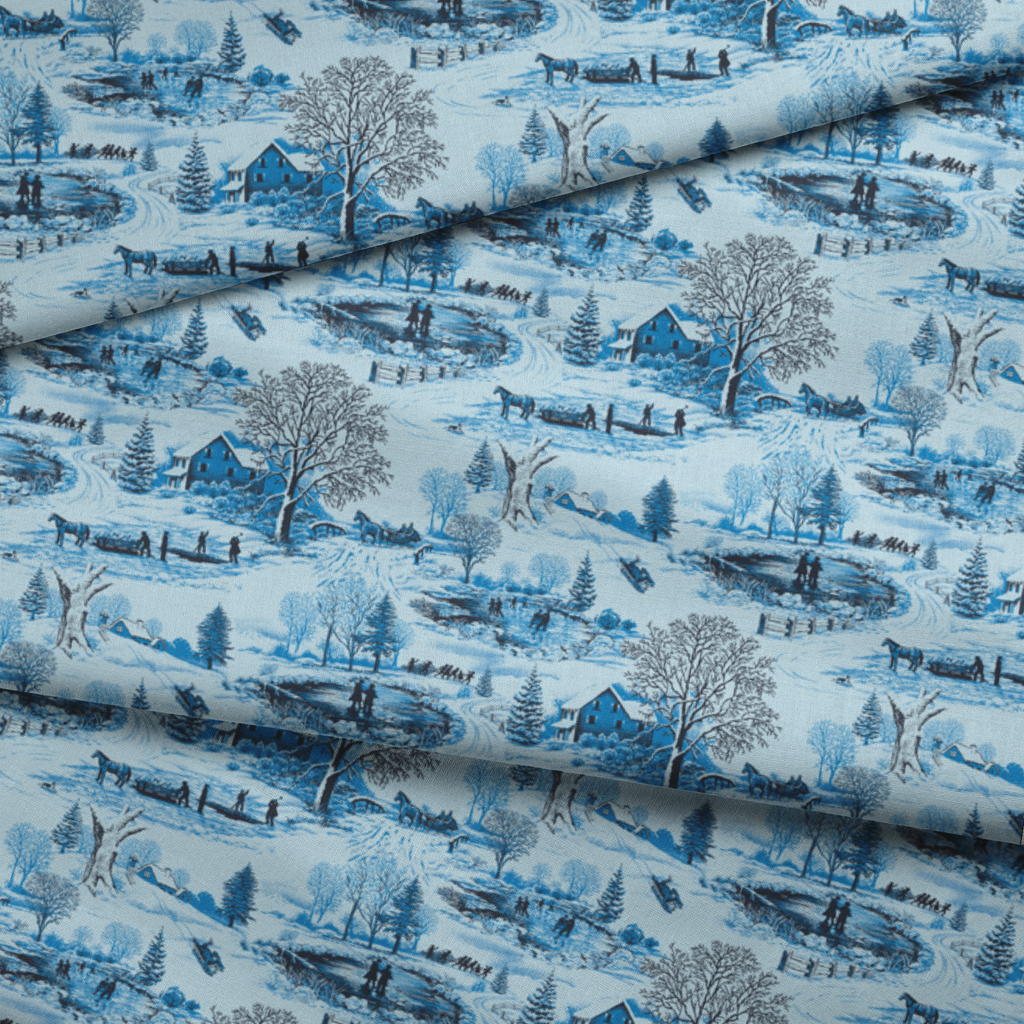 This scenic winter fabric showcases a charming traditional pattern with blue snow-covered landscapes, rustic houses, and evergreen trees, perfect for holiday quilting or seasonal home decor projects.