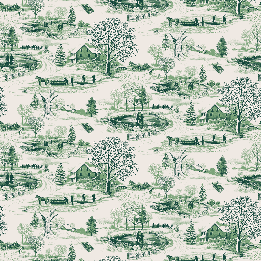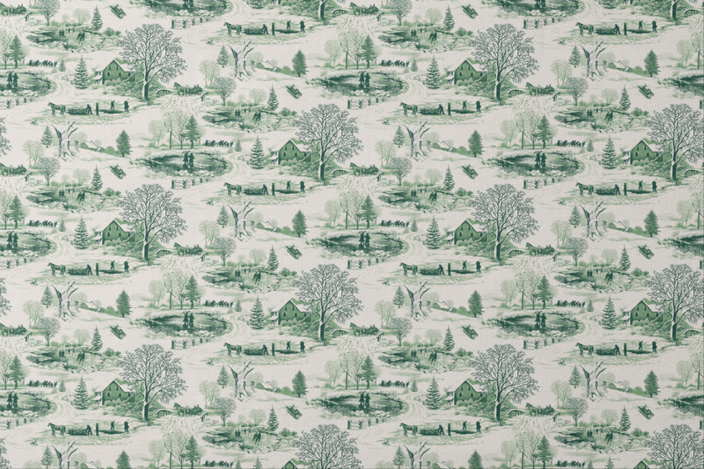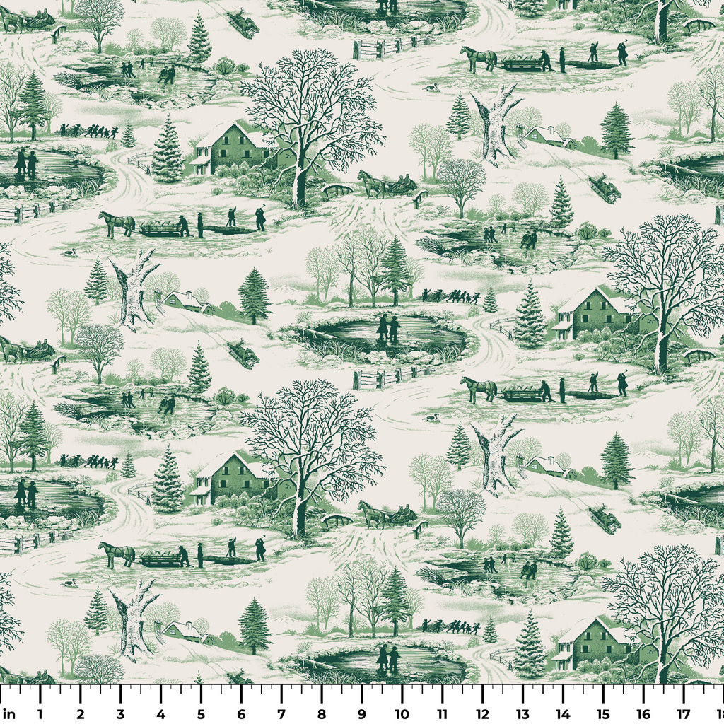 This scenic winter fabric showcases a charming traditional pattern with green snow-covered landscapes, rustic houses, and evergreen trees, perfect for holiday quilting or seasonal home decor projects.
