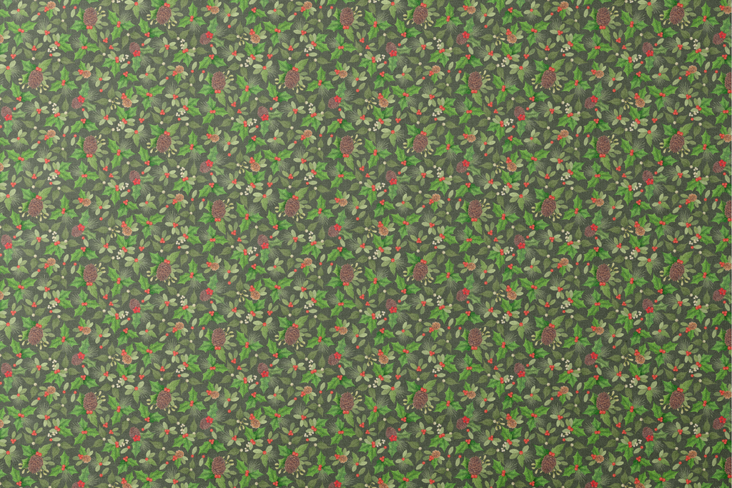 Classic holiday greenery comes to life with pinecones, holly, berries, and winter foliage in this rich all-over fabric design by Nicole Tamarin. This print is ideal for holiday and seasonal quilting projects, handmade gifts and festive apparel to celebrate the season with.
