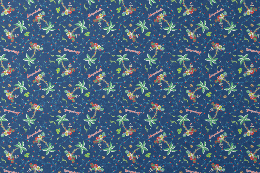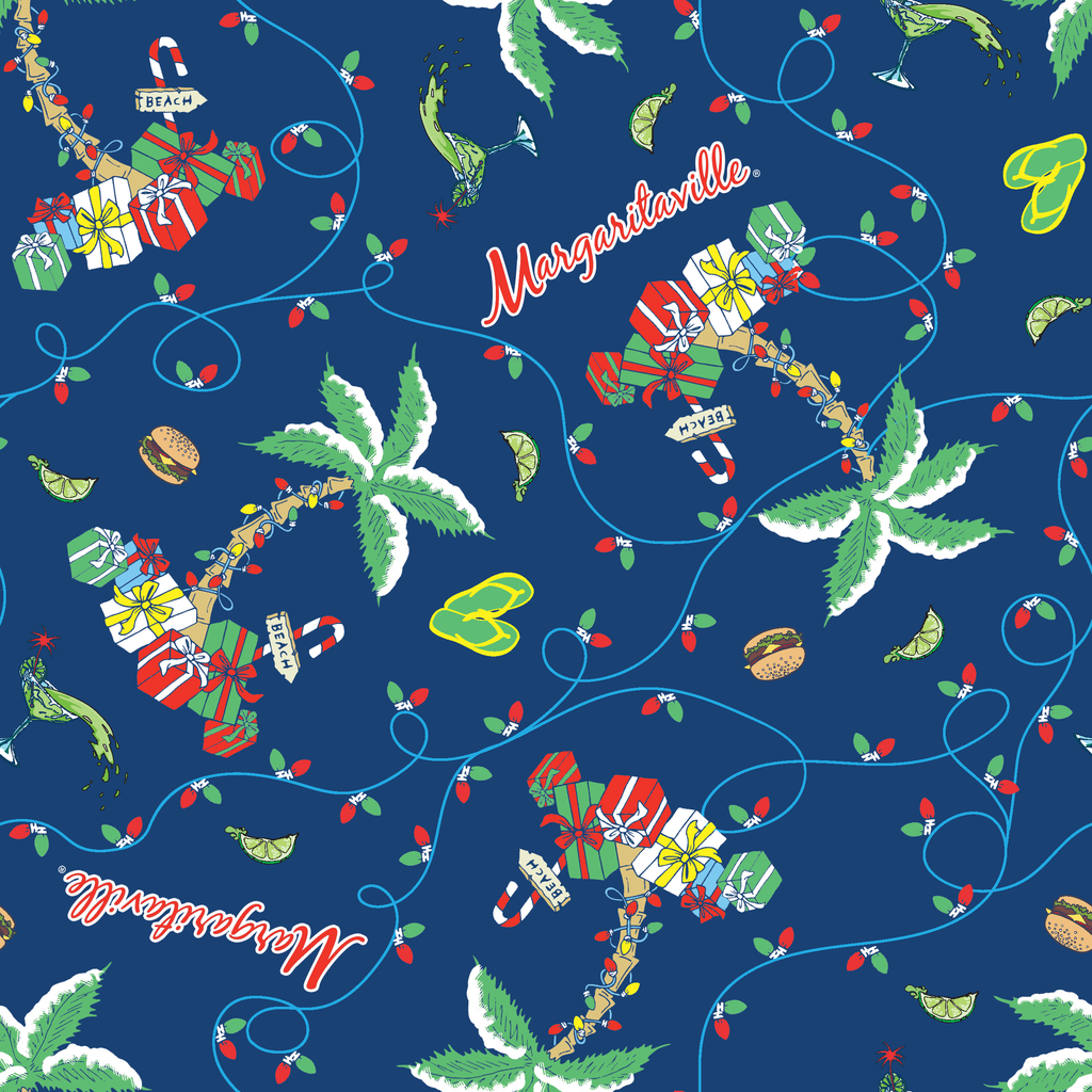 Sail away to paradise with this festive Margaritaville fabric showcasing a cheerful holiday beach theme on a deep navy background. Colorful wrapped presents, candy canes with "BEACH" signs, palm trees, lime wedges, and cheeseburgers are playfully scattered across the design, all connected by swirling strands of blue Christmas lights. This whimsical cotton print is perfect for creating unique summer-meets-holiday table runners or a fun beach-themed gift bag that will bring smiles all season long.