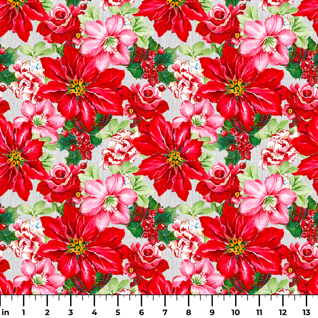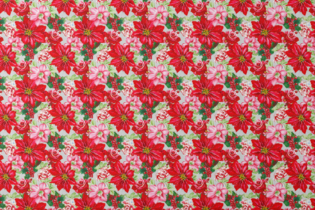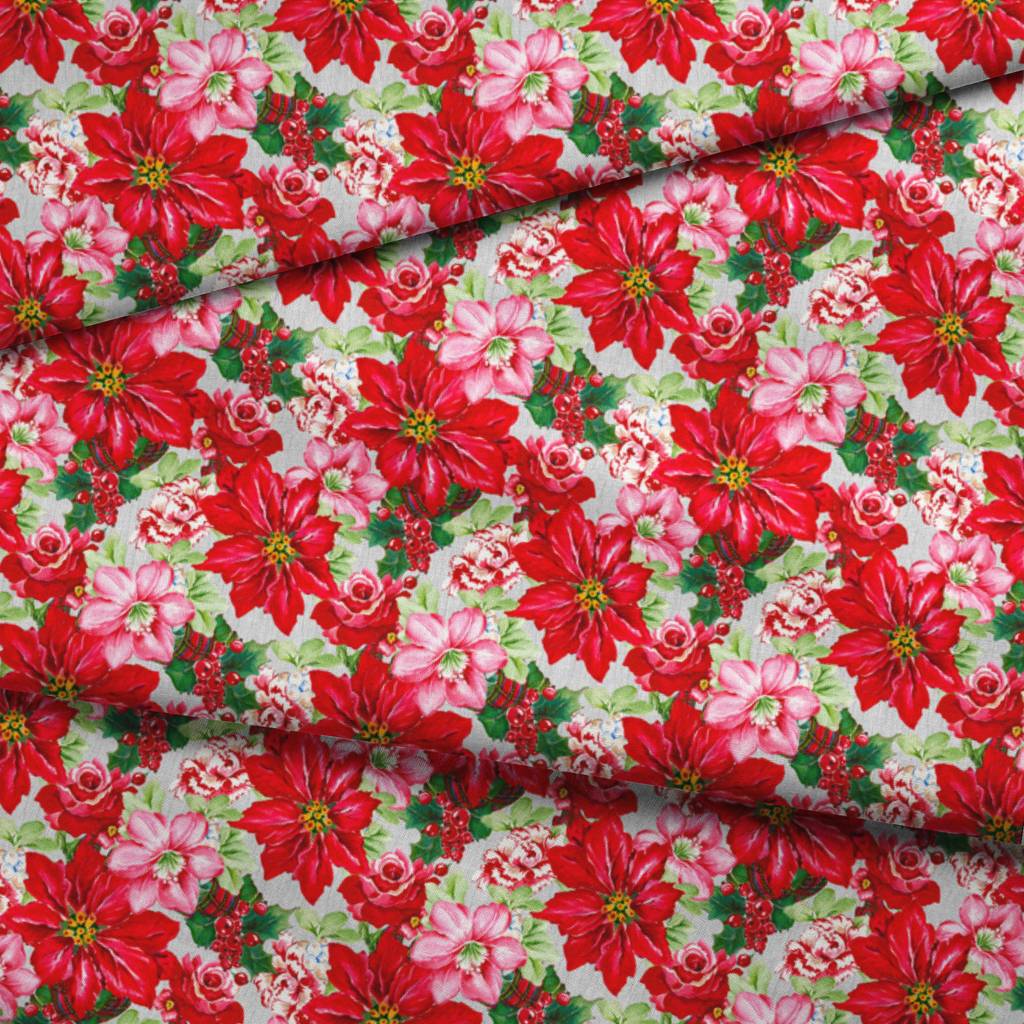 Vibrant Christmas floral pattern featuring bold red poinsettias, delicate pink blooms and festive greenery in a traditional holiday design perfect for seasonal home decor and crafts.