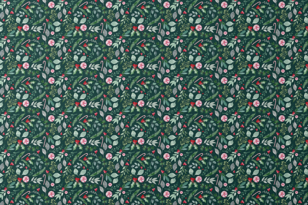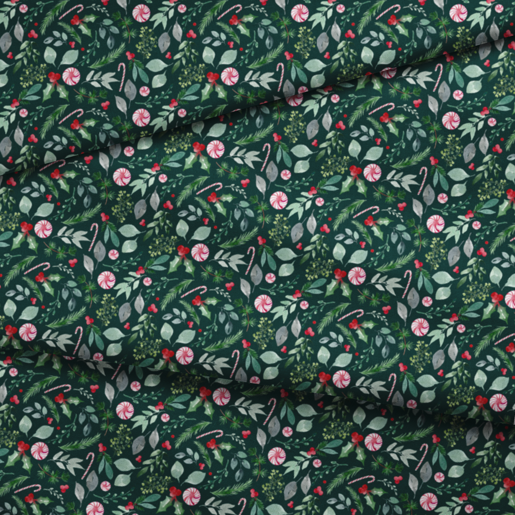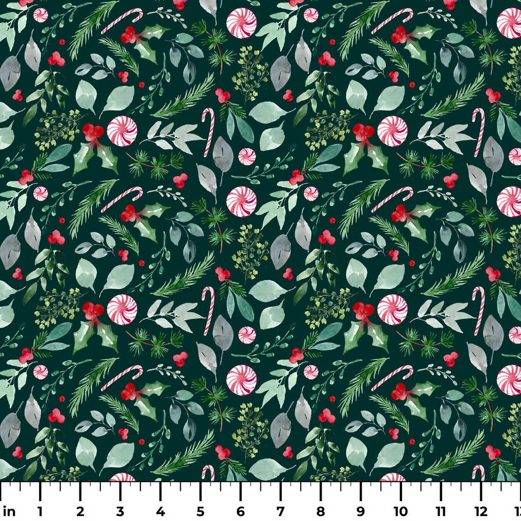 Festive watercolor botanicals dance across a rich forest green backdrop in this enchanting holiday print. Delicate pine sprigs, silvery eucalyptus leaves, and holly berries mingle with whimsical peppermint candies and candy canes, creating a sophisticated yet playful winter motif. This versatile fabric would make a stunning table runner or festive throw pillows that bring seasonal cheer without overwhelming your space.