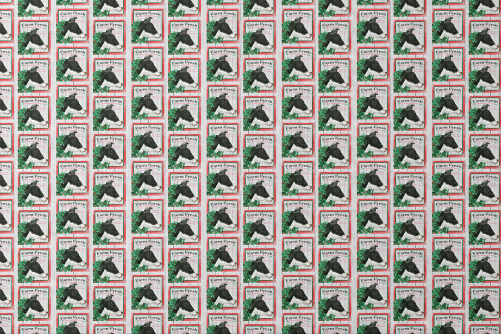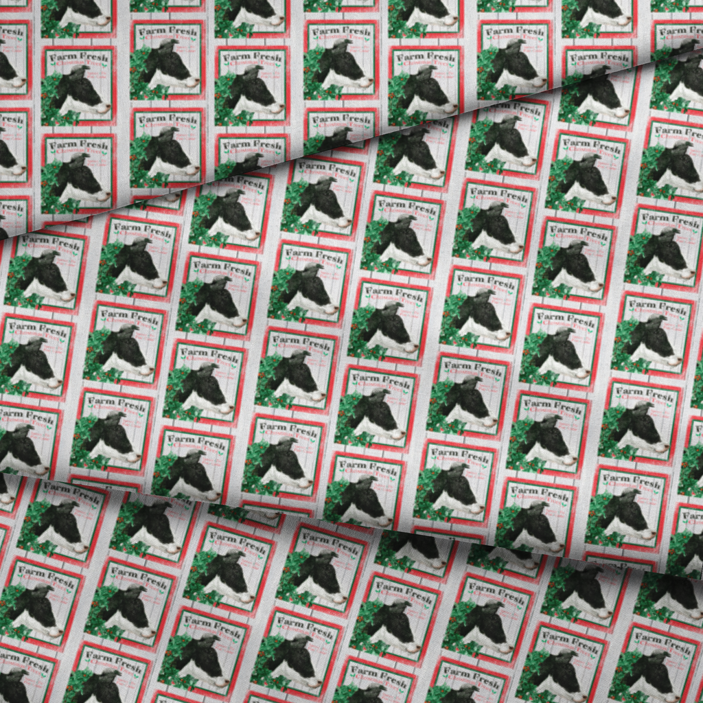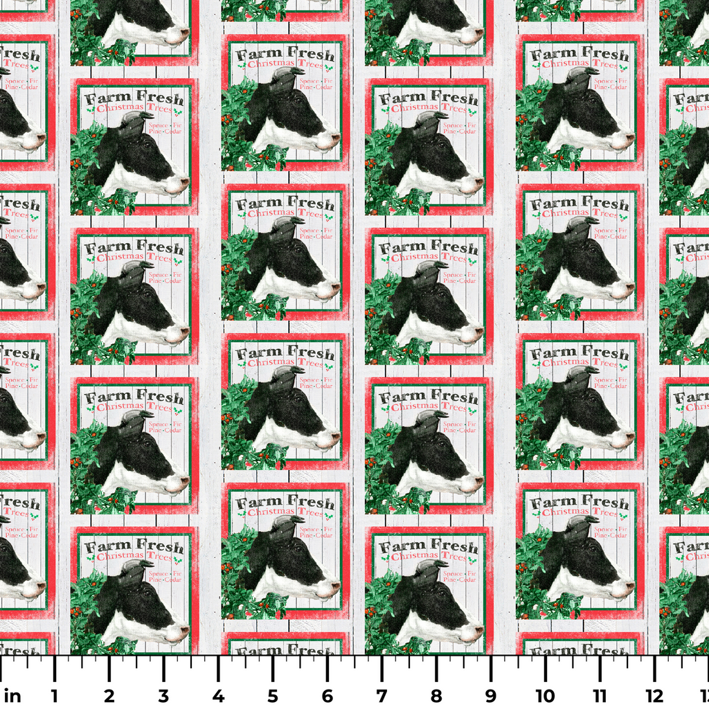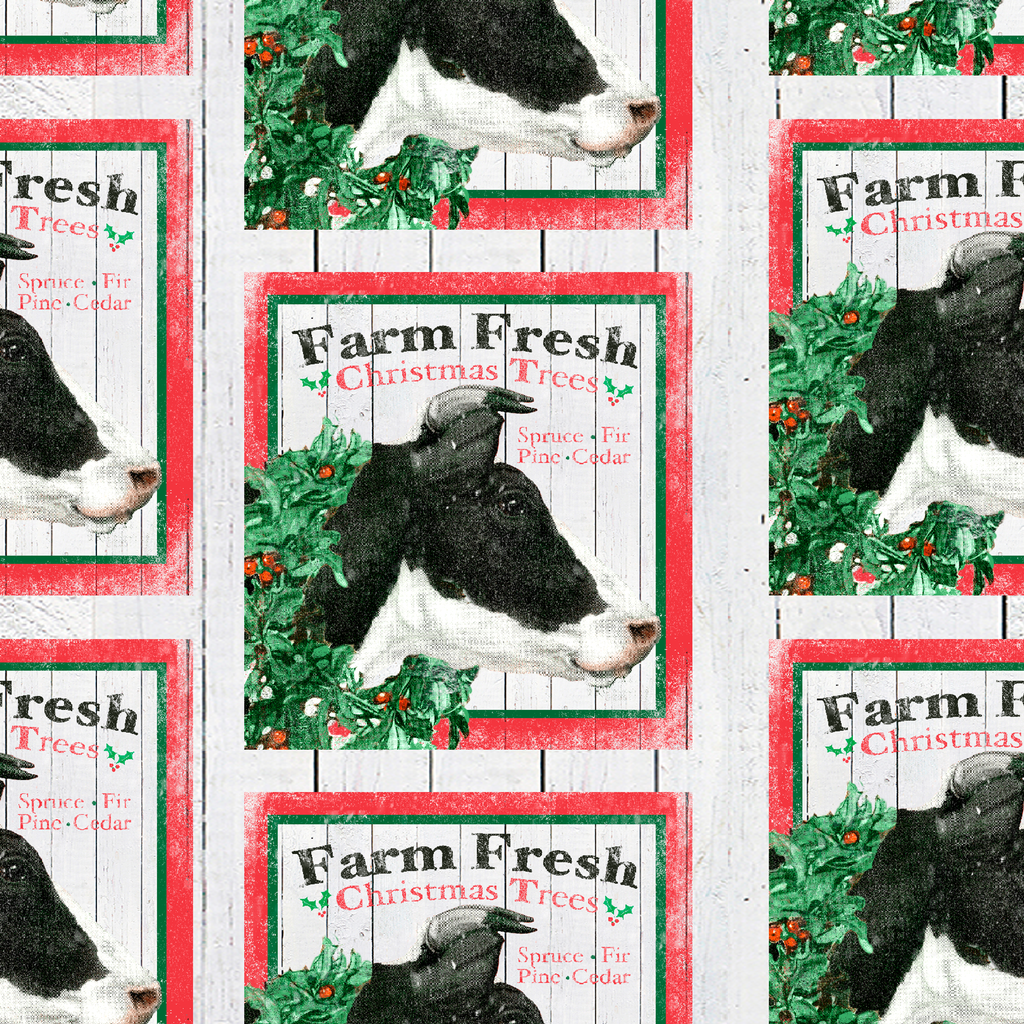 This charming holiday fabric features a nostalgic farmhouse Christmas theme with black and white border cows alongside "Farm Fresh Christmas Trees" signs on whitewashed wooden backgrounds. Festive red borders frame each vignette, while sprigs of holly with bright berries add pops of seasonal green and red throughout the design. Perfect for crafting holiday table runners, stockings, or a cozy throw pillow that brings rustic country charm to your Christmas décor.