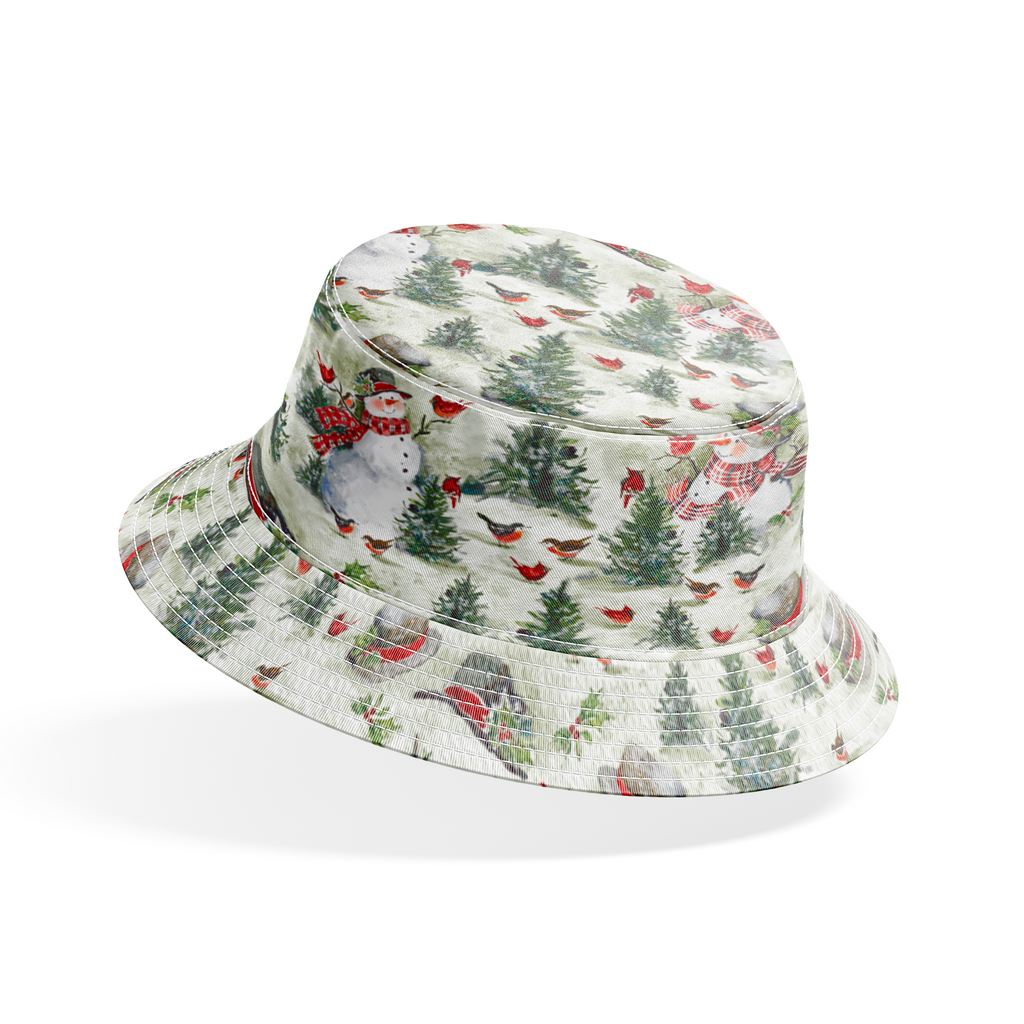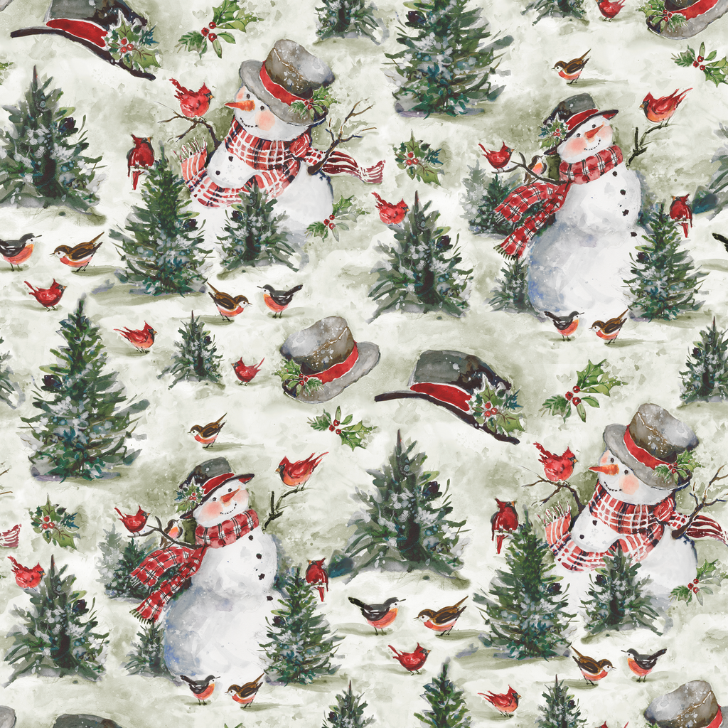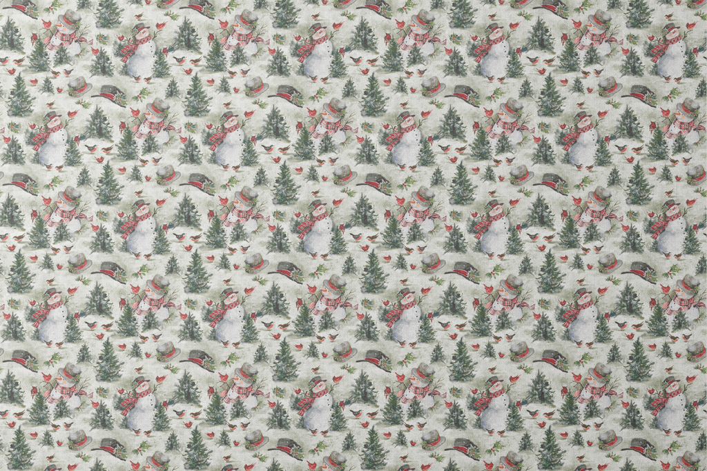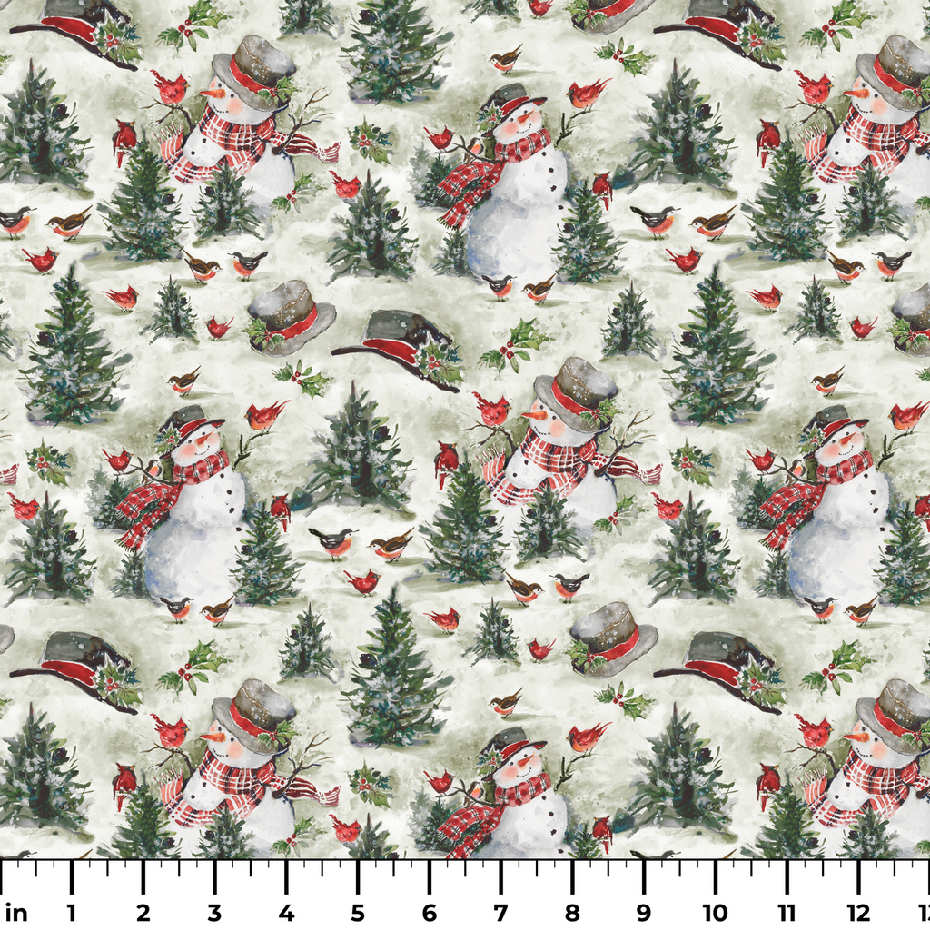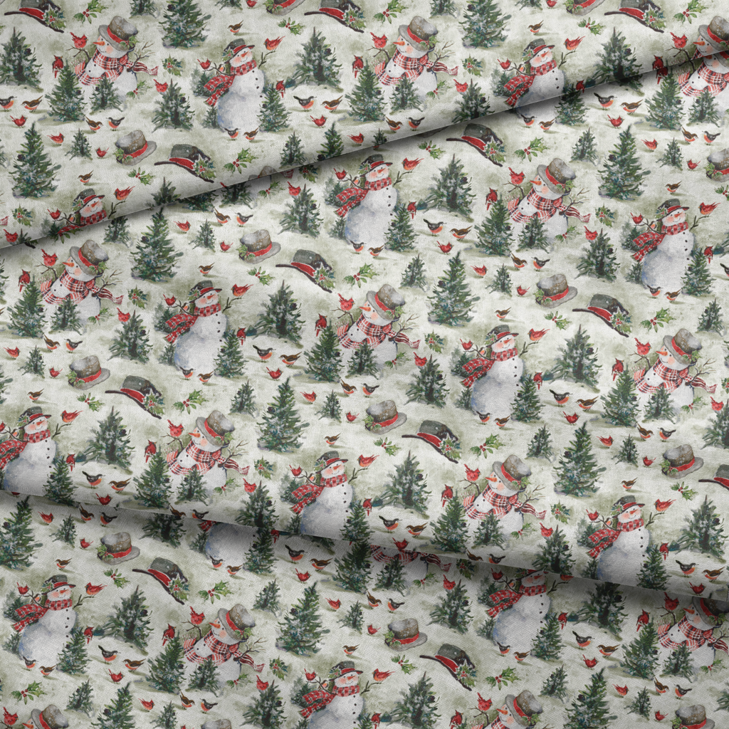 Festive winter fabric featuring snowmen with scarves, evergreen trees, and small red birds against a green background - perfect for holiday quilting or seasonal home décor projects.