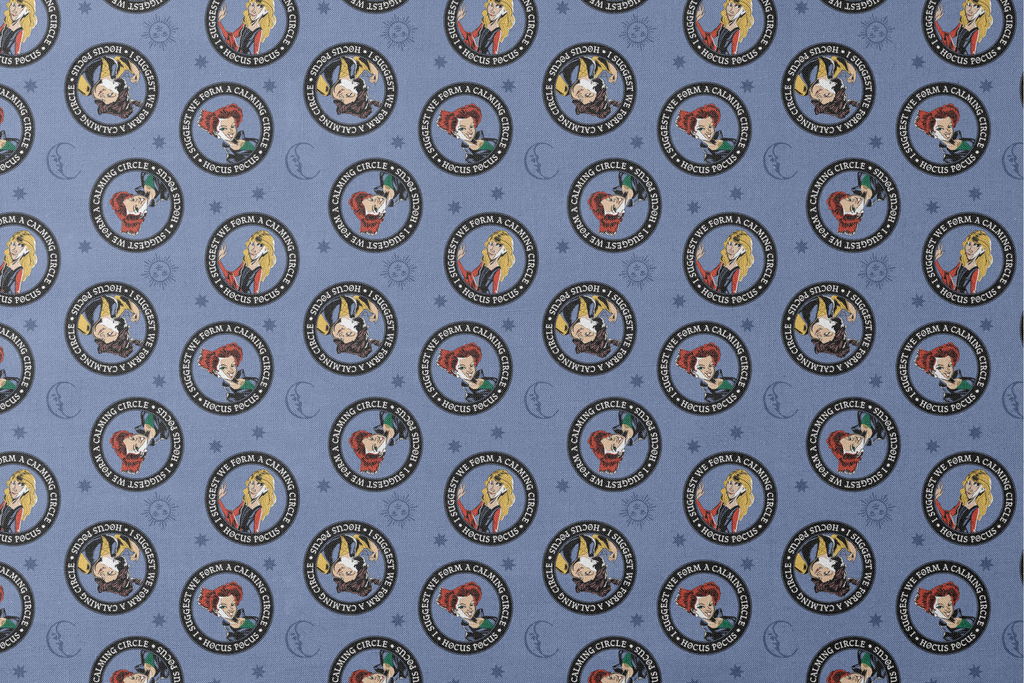 This magical Disney fabric features Hocus Pocus witches in circular medallions, with "Hocus Pocus" text on a blue background with stars and moons. Perfect for Halloween crafting or Disney-inspired home decor projects.