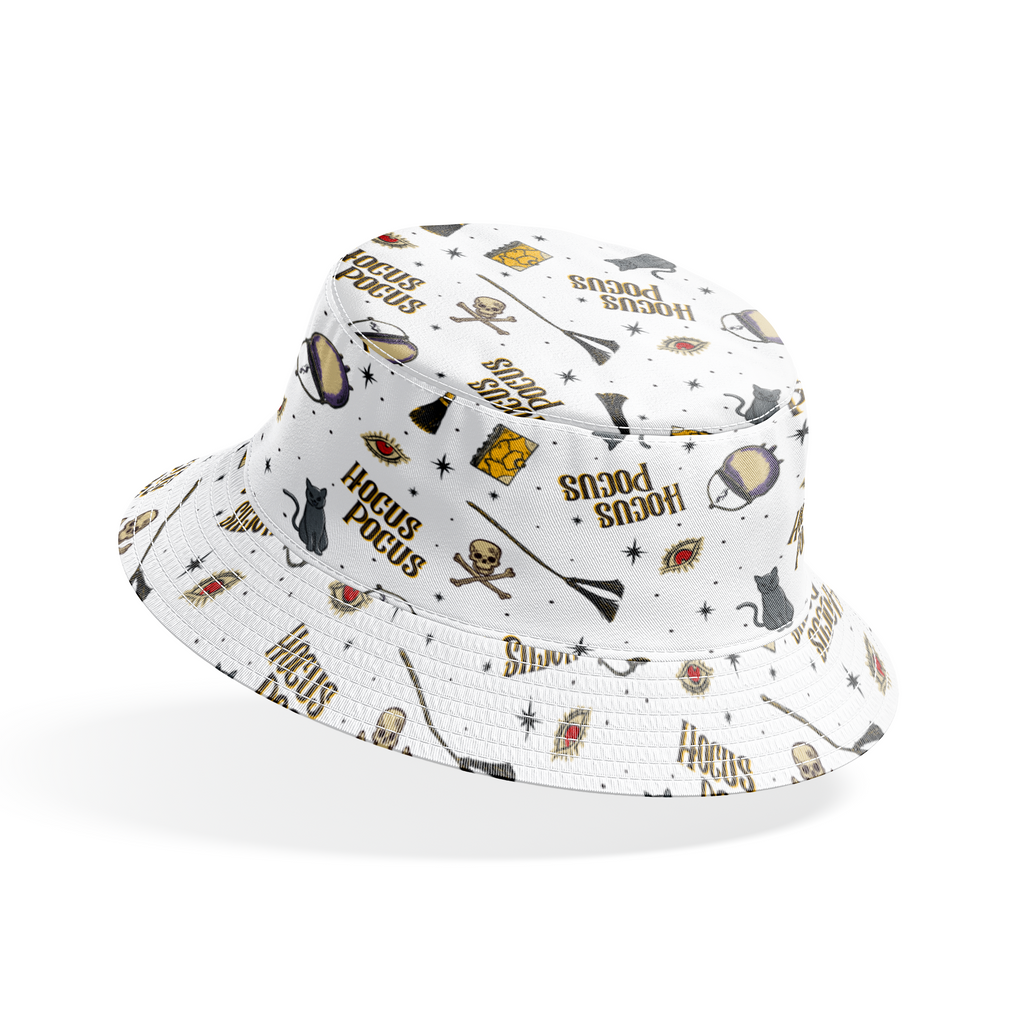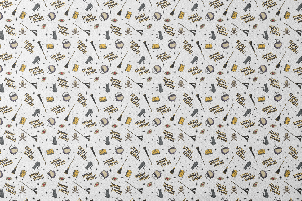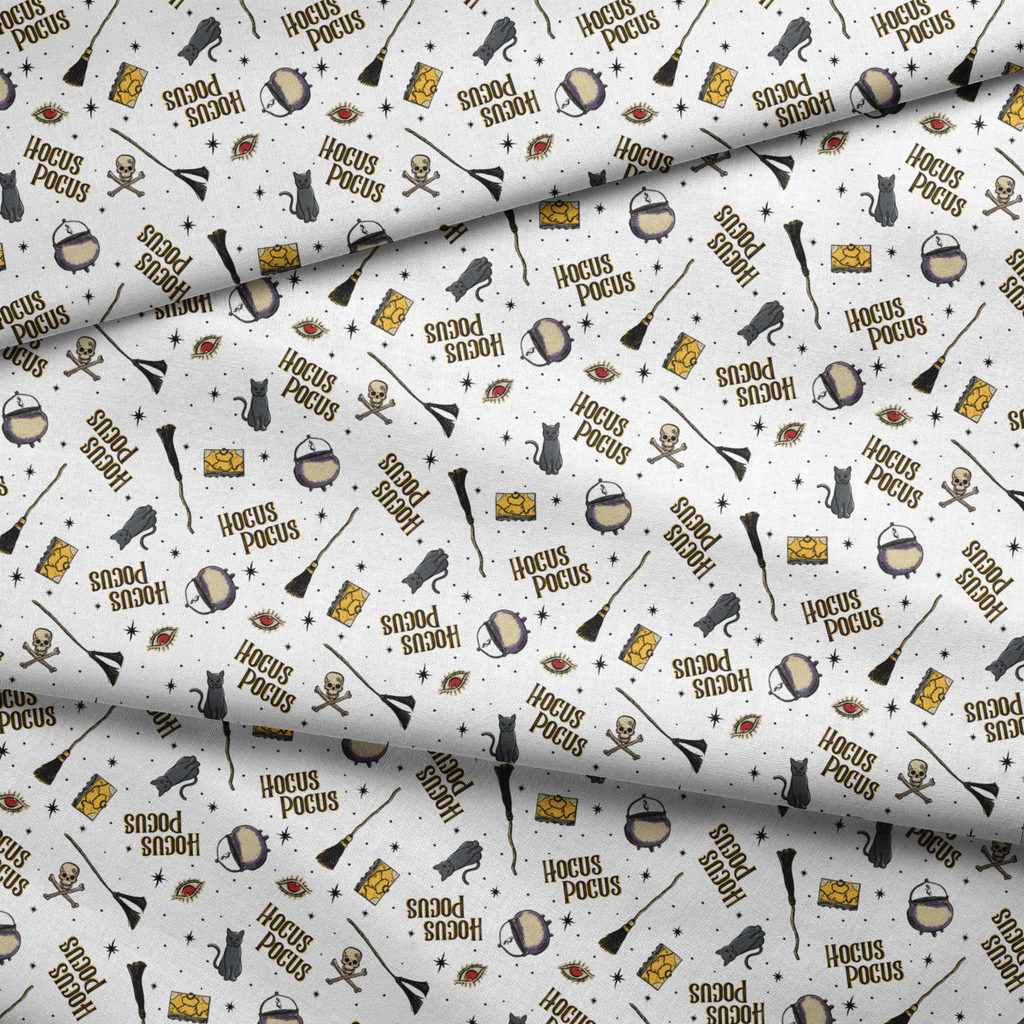 Spooky Disney Hocus Pocus pattern featuring cauldrons, broomsticks, skulls, spellbooks, and mystical eyes on a white background. Perfect for Halloween crafting, quilting, and magical-themed projects.