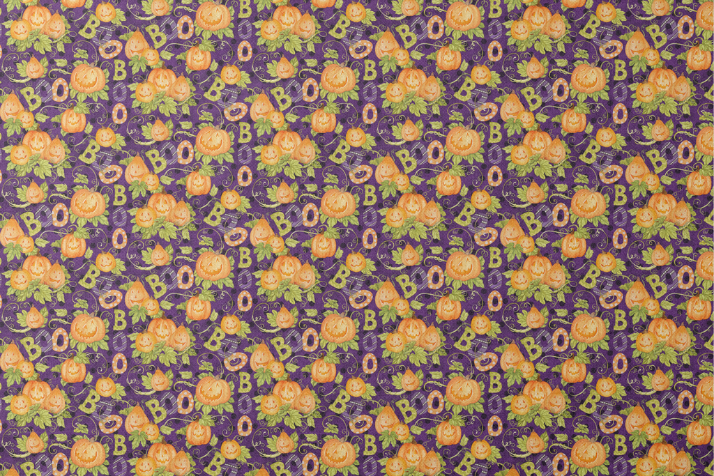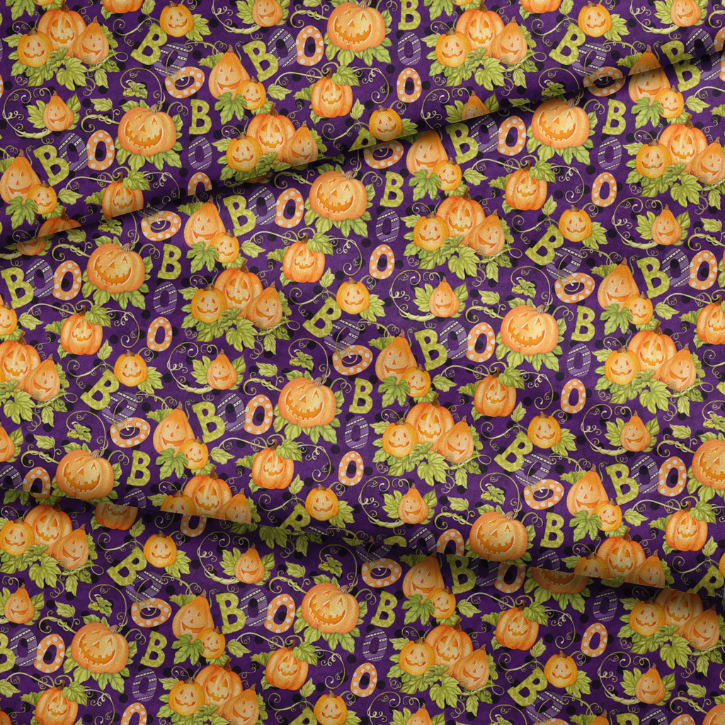 Cheerful jack-o’-lanterns, swirling vines, and bold “BOO” lettering pop against a deep purple background in this festive Halloween fabric design by Nicole Tamarin. This design is ready for your next seasonal DIY, spooky sewing project or Halloween quilt.