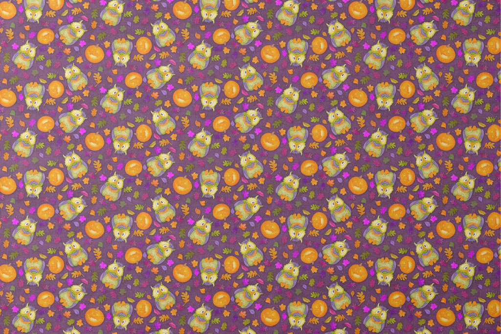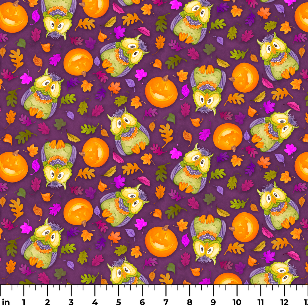Whimsical owls, pumpkins, and autumn leaves in vivid fall colors make this playful Halloween fabric design by Nicole Tamarin perfect for sewing festive seasonal projects like trick or treat bags or even a DIY bandana for your favorite four-legged friend.