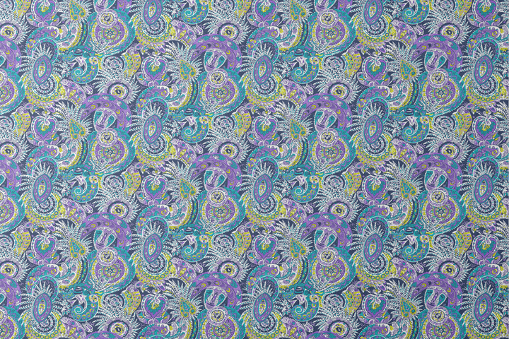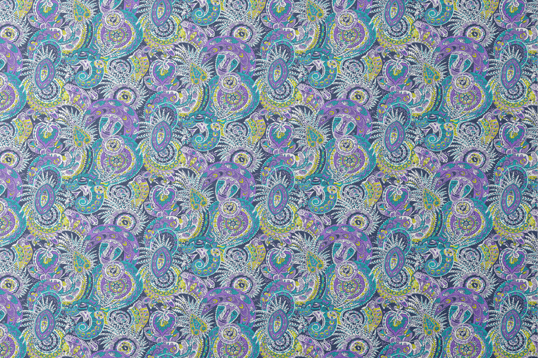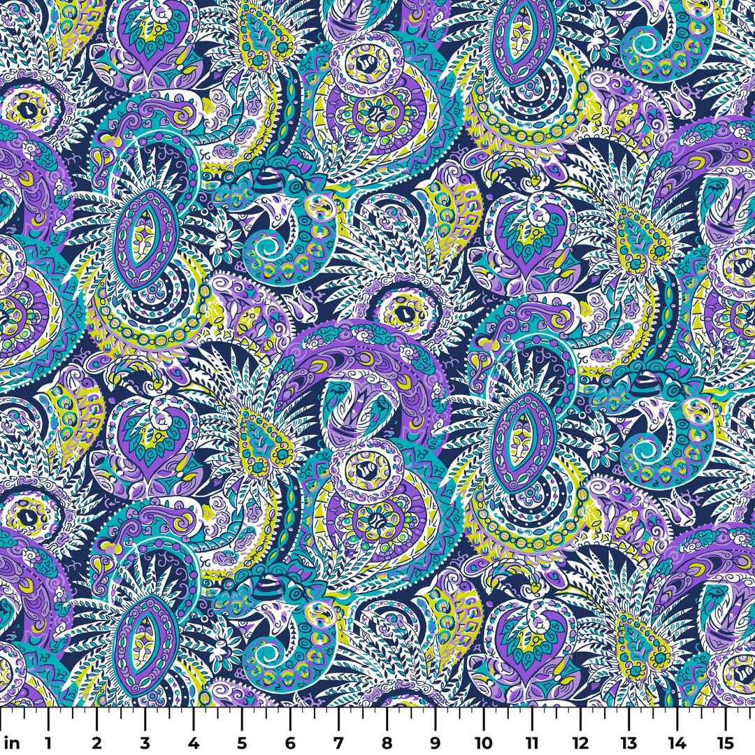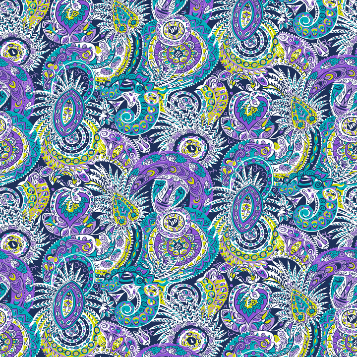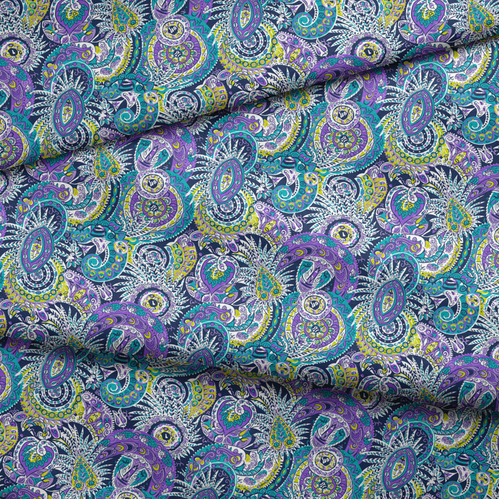 Vibrant paisley design in rich purple, blue, and yellow with intricate swirls and organic shapes. This bohemian pattern features ornate details in cool-tones and white for a classic yet contemporary look.