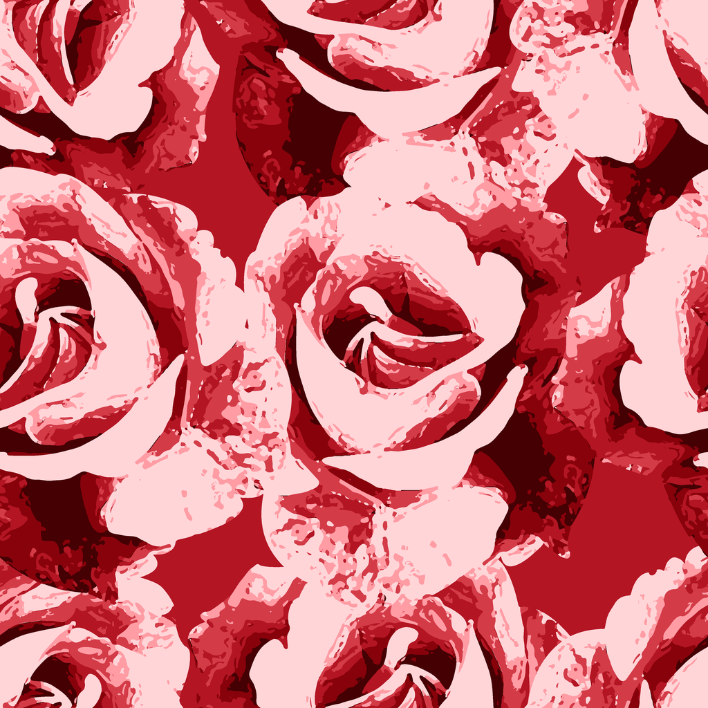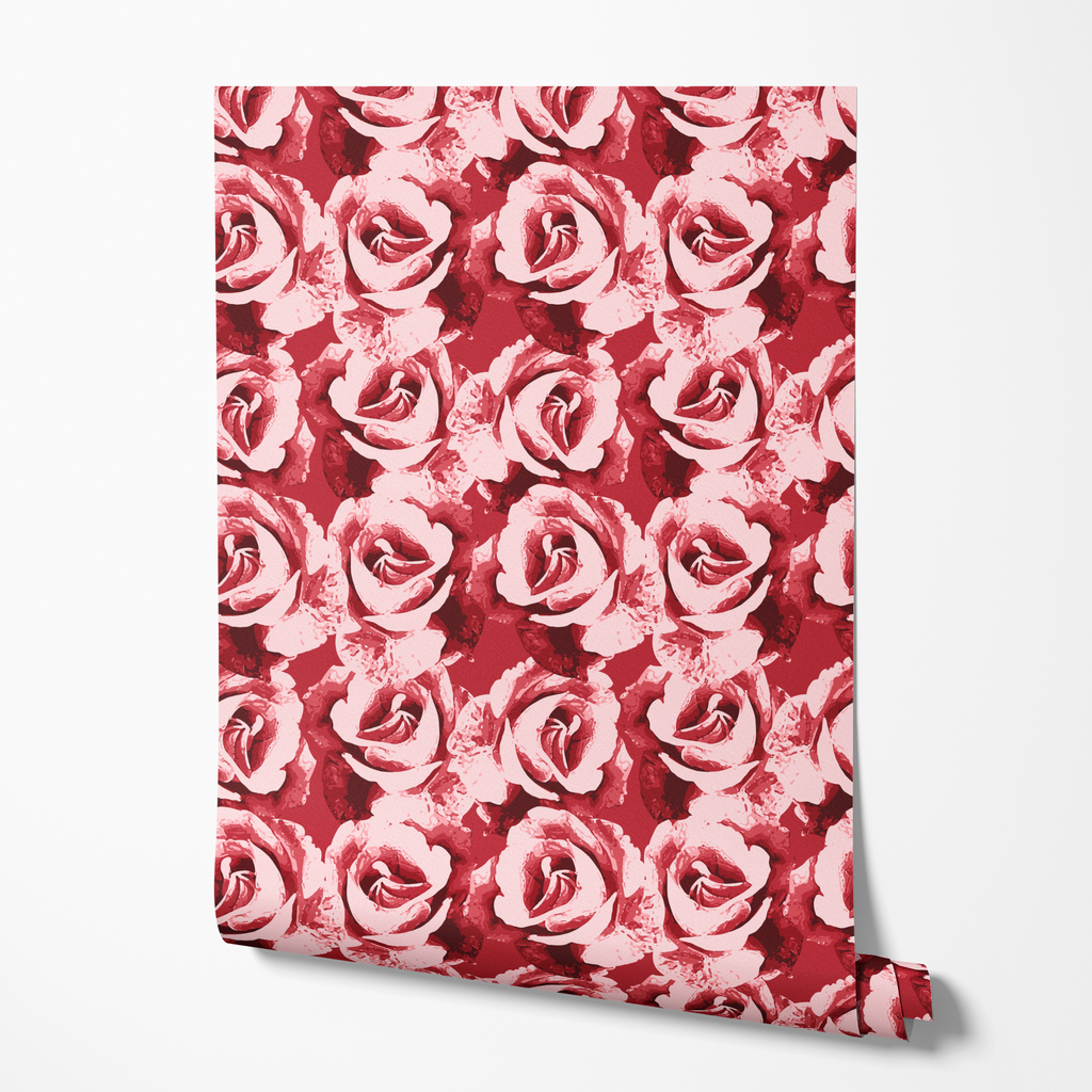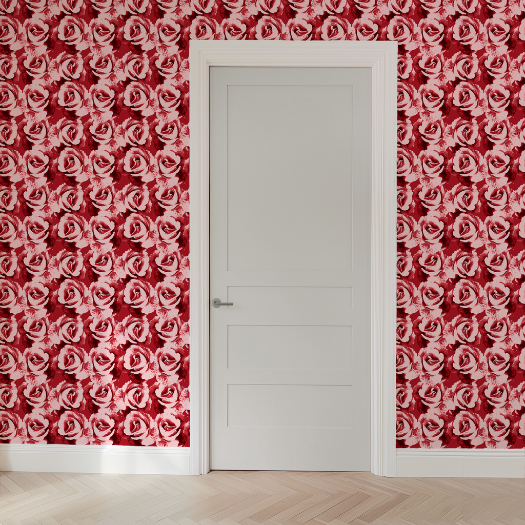 Pop-Art inspired floral featuring sweet pink and red roses creates a luxe monochrome look perfect for moody and romantic spaces.