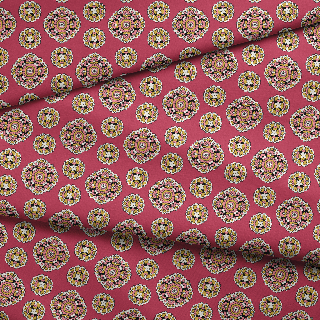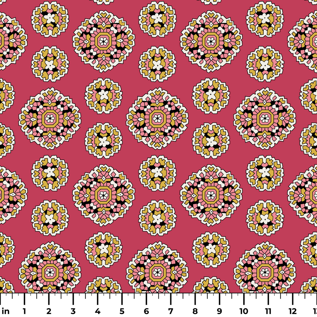 Vibrant red background showcases ornate floral medallions in a traditional folk art style with colorful geometric patterns and intricate botanical motifs.
