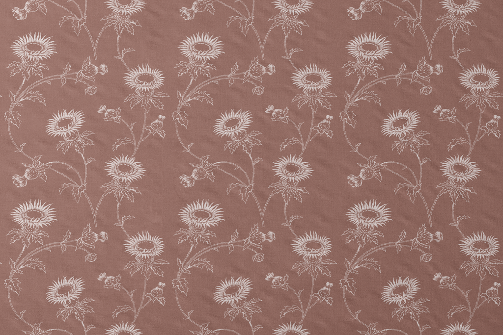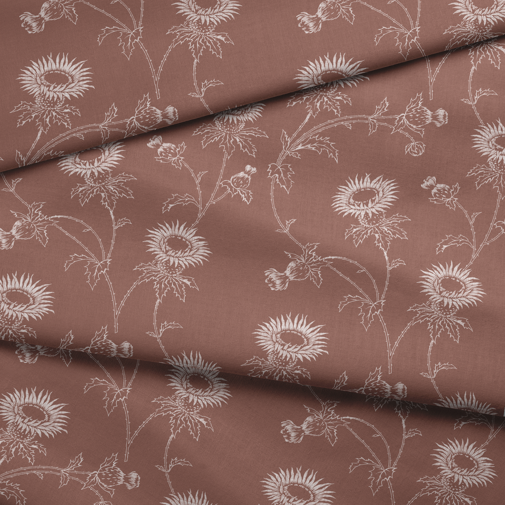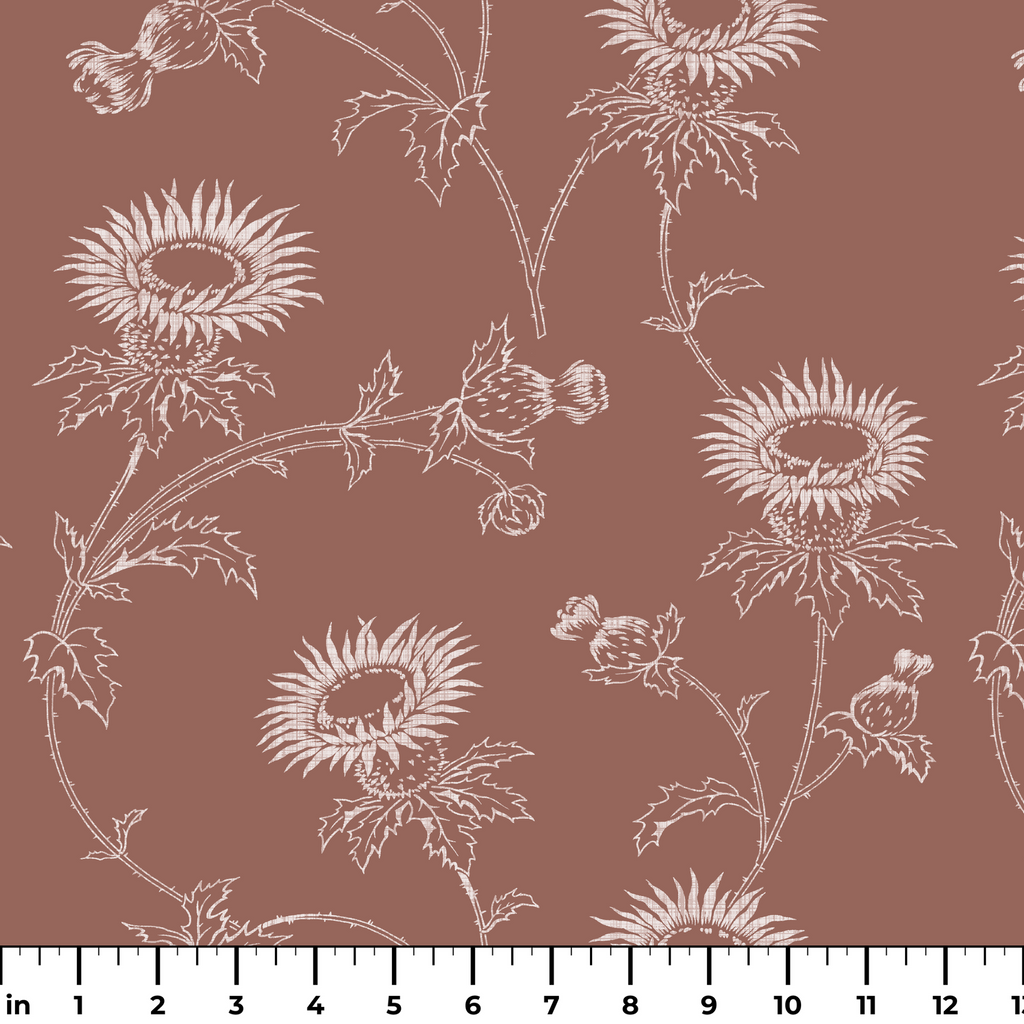 Elegant thistle botanical pattern with delicate white line sunflower drawings on a warm rust background.