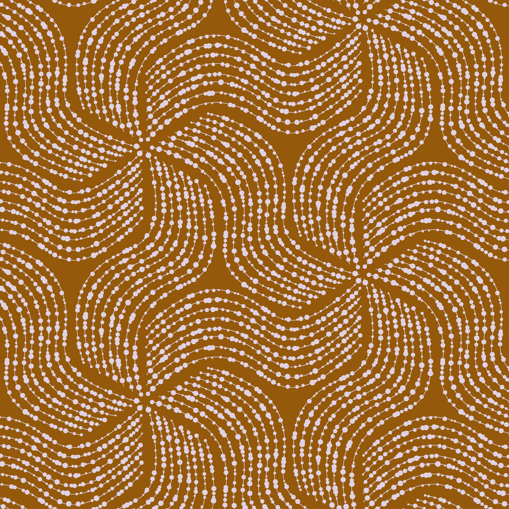 Warm golden brown fabric featuring flowing dotted waves in a mesmerizing aboriginal-inspired pattern with white beaded details creating rhythmic curved lines across the surface.