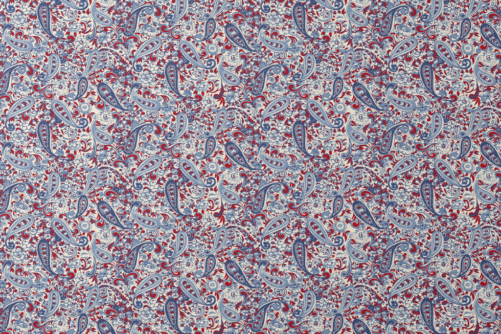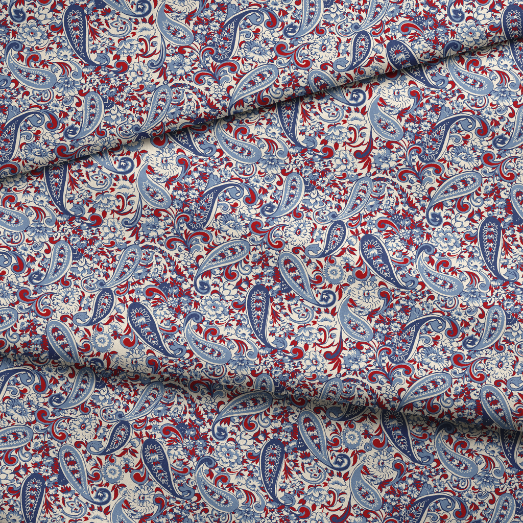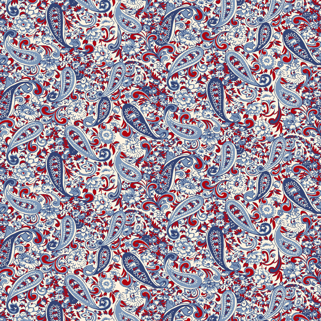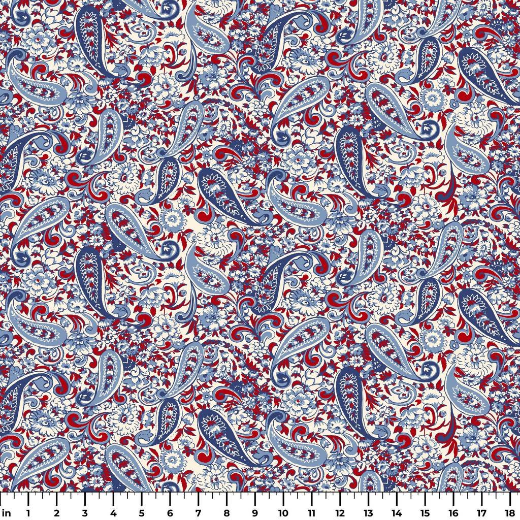 Intricate paisley swirls in navy blue and powder blue dance across a cream background, interspersed with deep crimson accents and delicate floral details. The classic Americana color palette gives this traditional pattern a fresh, patriotic twist while maintaining its timeless appeal. This design would make stunning quilting projects or eye-catching home décor items like throw pillows and table runners for your Fourth of July gathering or year-round farmhouse style.
