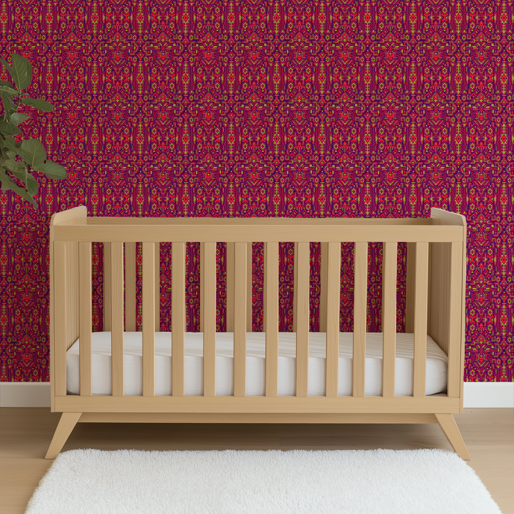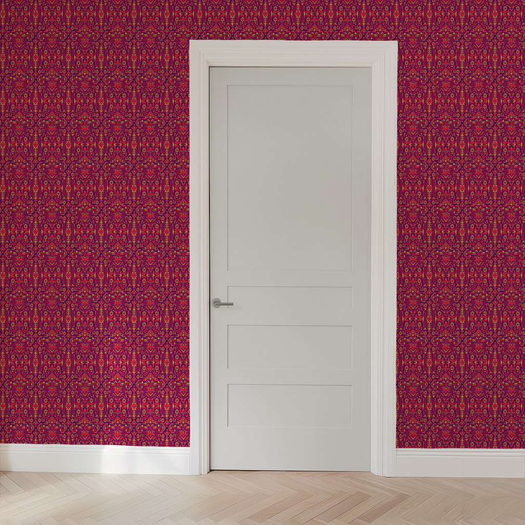 Vibrant geometric pattern in rich pink, purple, and gold tones with intricate tribal-inspired motifs creating a bold, contemporary ethnic design perfect for any space.