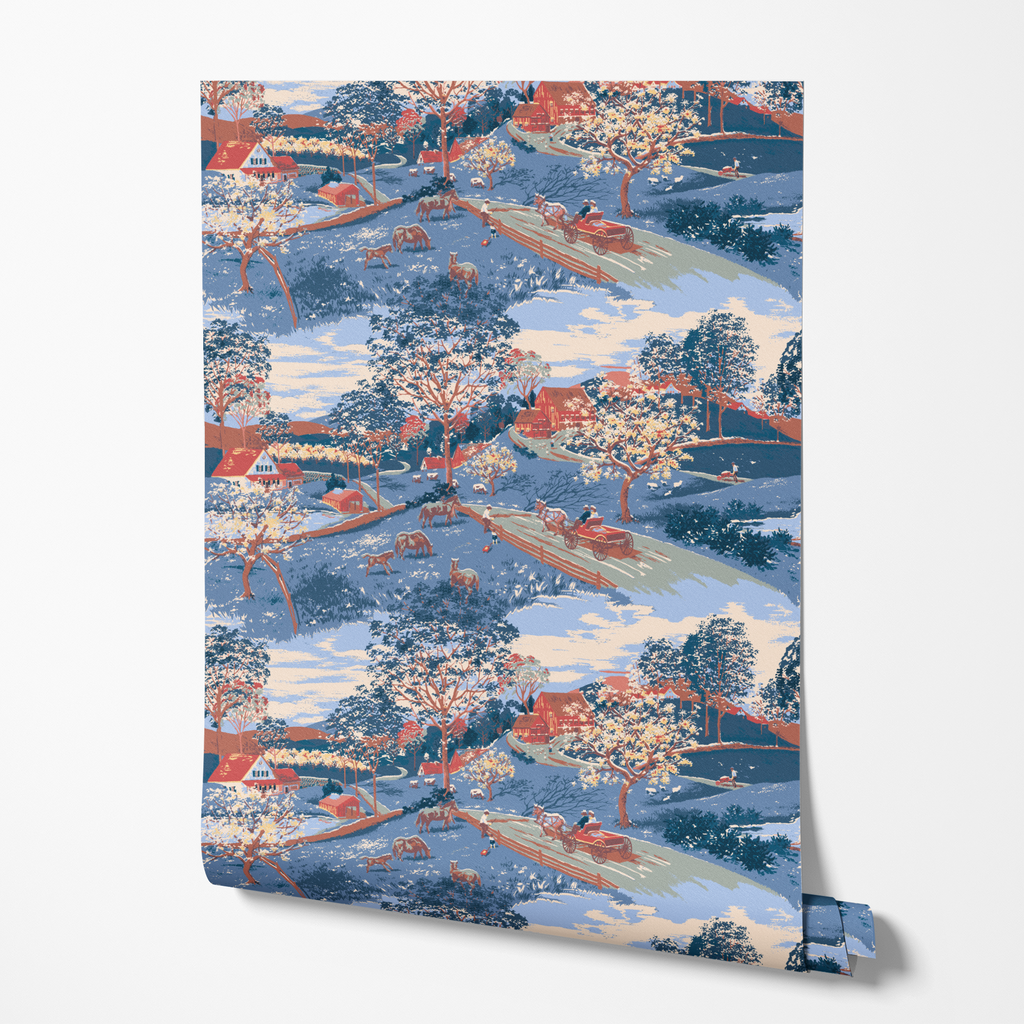 Beautiful landscape featuring traditional village scenes with blooming trees, houses, and serene views in coral, blue, and cream tones.