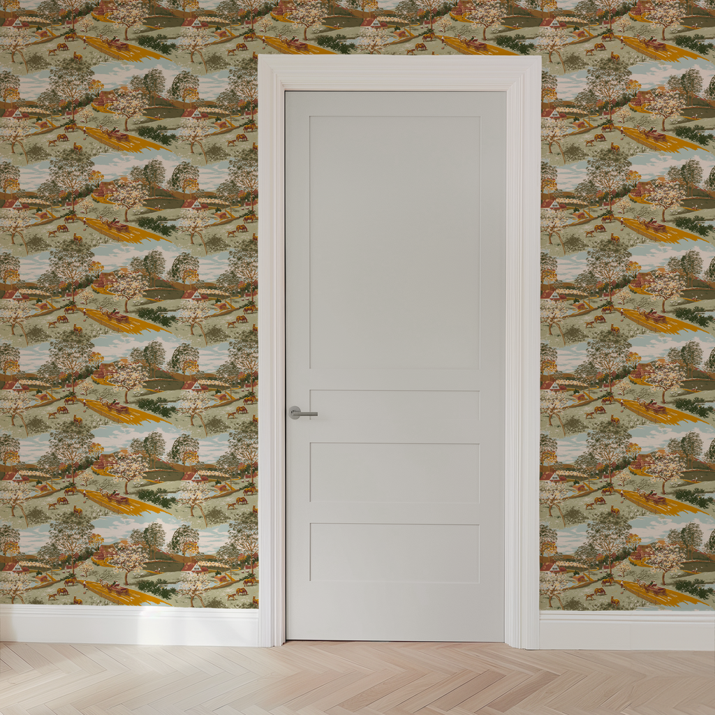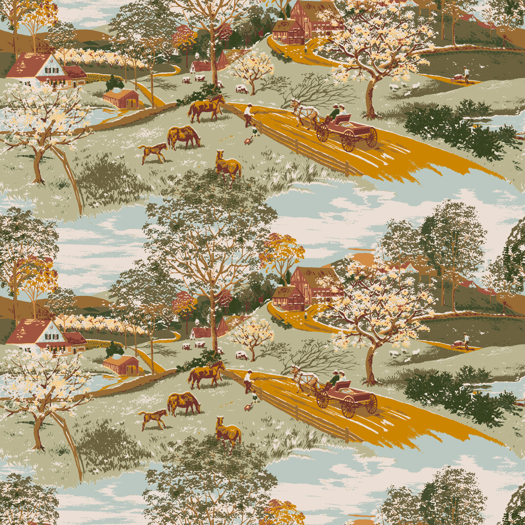 Vintage countryside landscape with golden roads, blooming trees, grazing cattle and traditional buildings in soft earth tones and pastels.