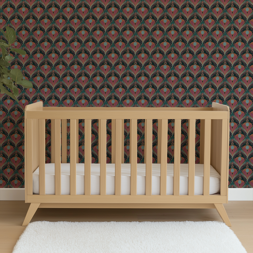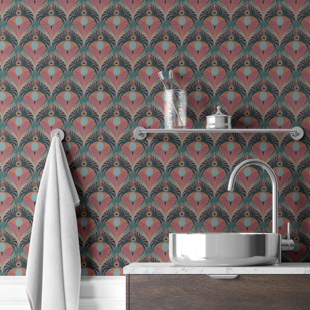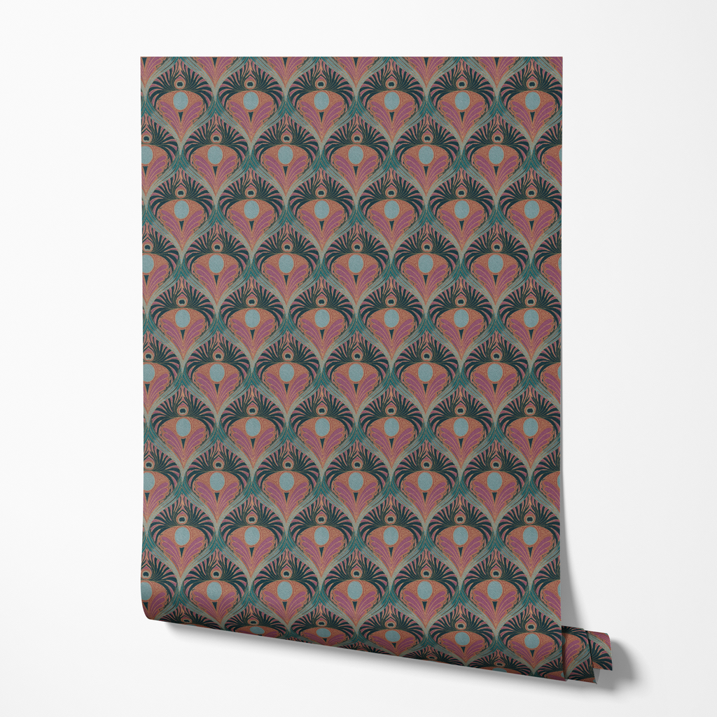 Elegant art deco peacock feather pattern featuring rich teal, purple, and gold tones in a luxurious vintage style perfect for upholstery or home decor.