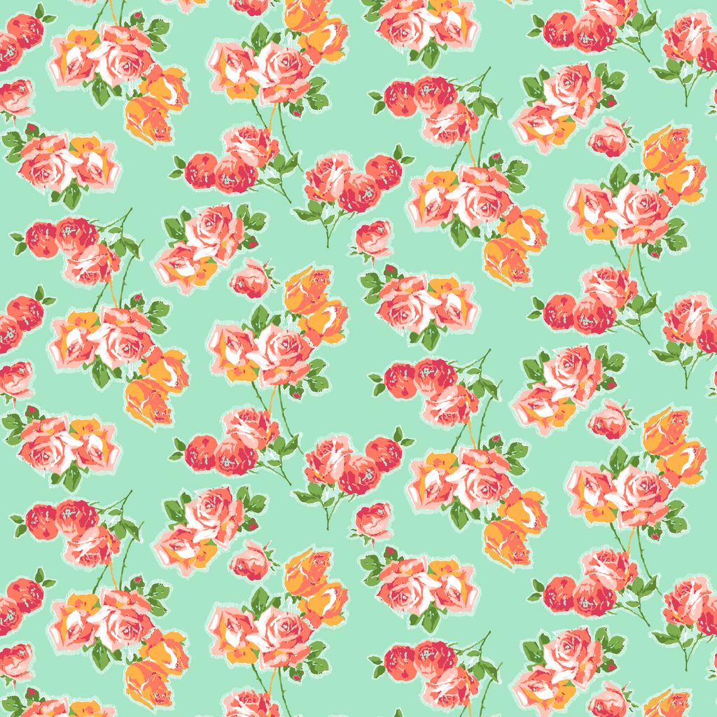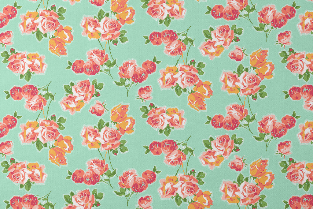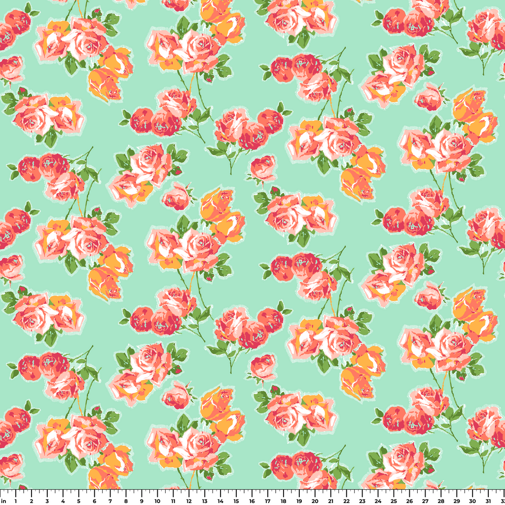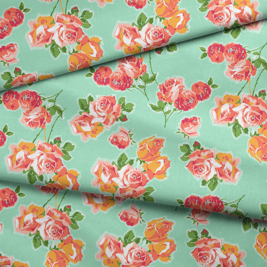 Vintage-inspired floral pattern featuring coral pink roses with green leaves on a mint background, perfect for romantic cottage-style home decor and quilting projects.