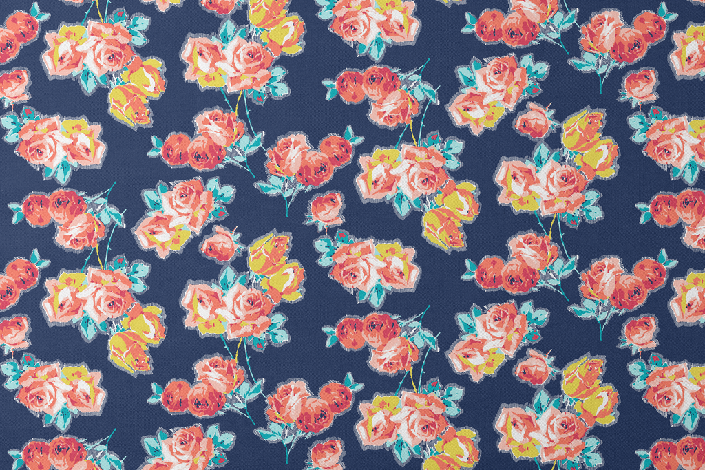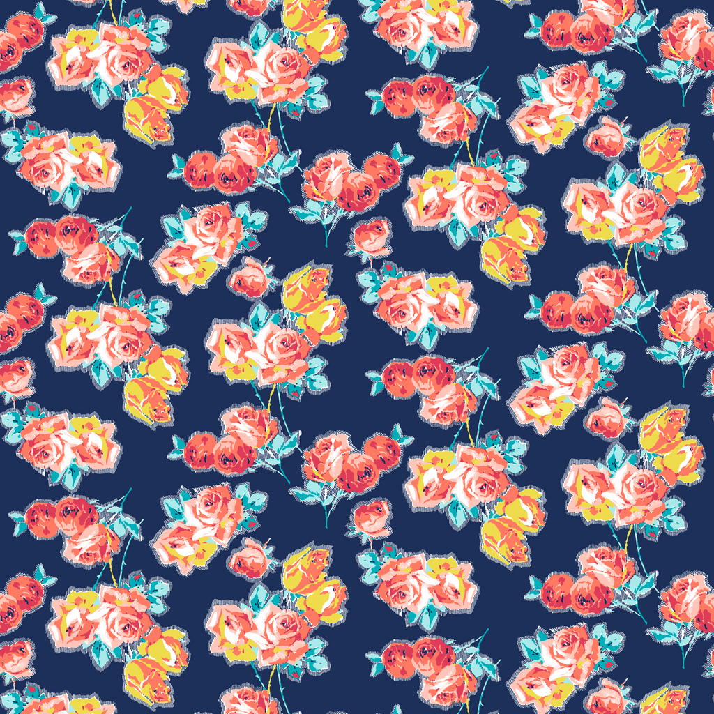 Vintage floral pattern with coral and pink roses on a navy blue background perfect for romantic cottage-style home decor and quilting projects.