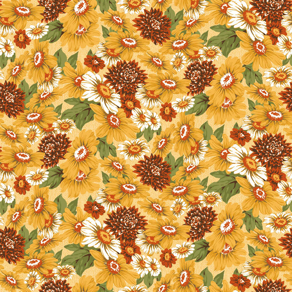 Vibrant fall florals in warm golden yellows, browns and green foliage, perfect for a cozy hygge vintage aesthetic.