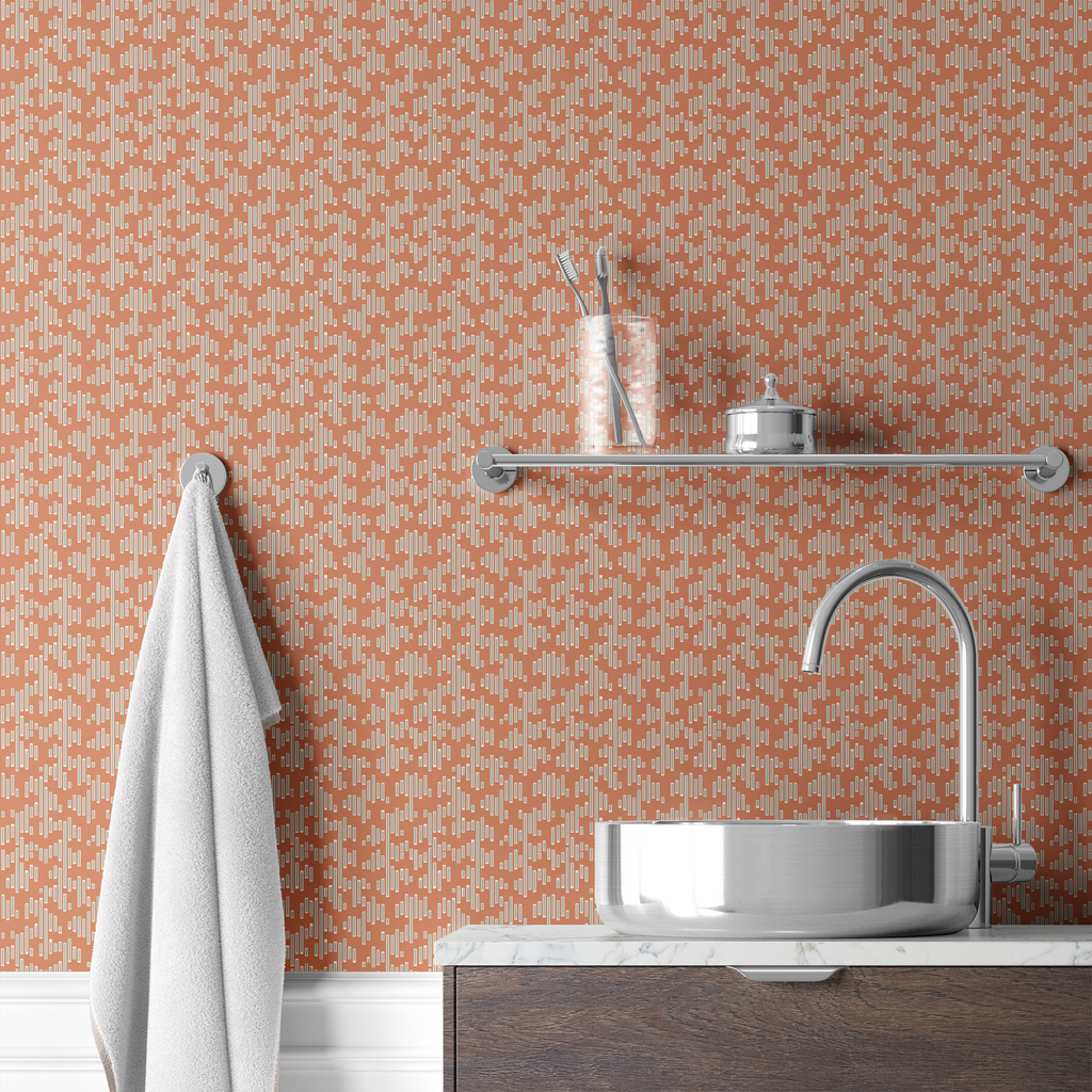Modern geometric pattern featuring vertical bars in mint green and white on a warm terracotta orange background, creating a dynamic mid-century modern abstract design.