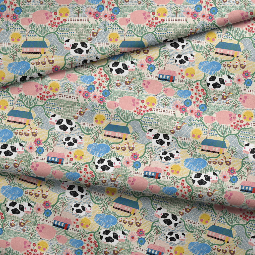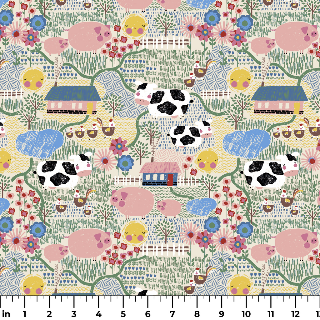 Turn your next project into a storybook come to life with this playful farm scene. With blooming florals, cheerful animals, and pastel sunshine, it's perfect for cheerful quilts, soft books, or nursery wall art.