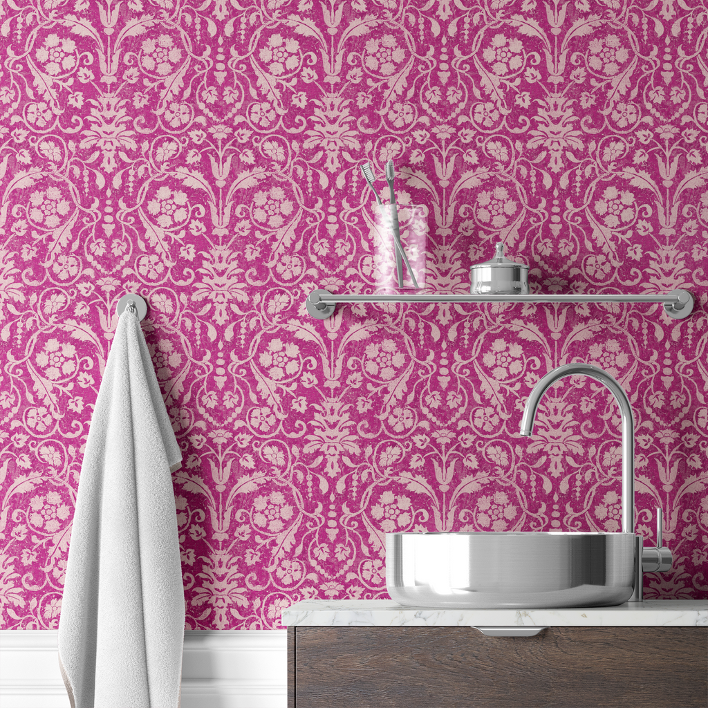 Elegant vintage damask pattern in vibrant pink and cream featuring intricate floral motifs and swirling vines - perfect for home decor with its traditional heritage design and romantic aesthetic.
