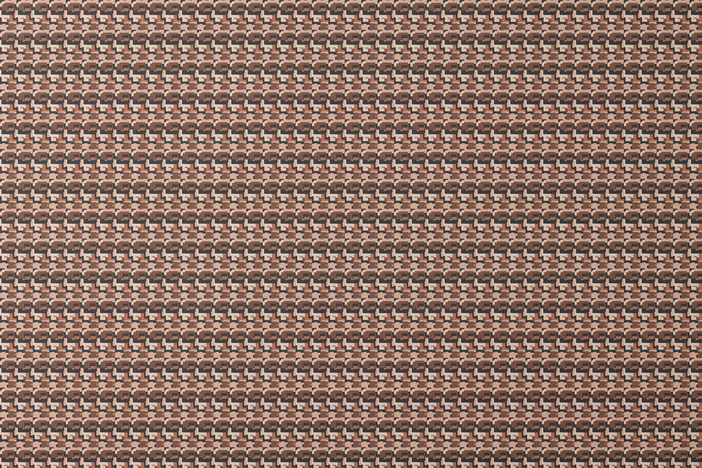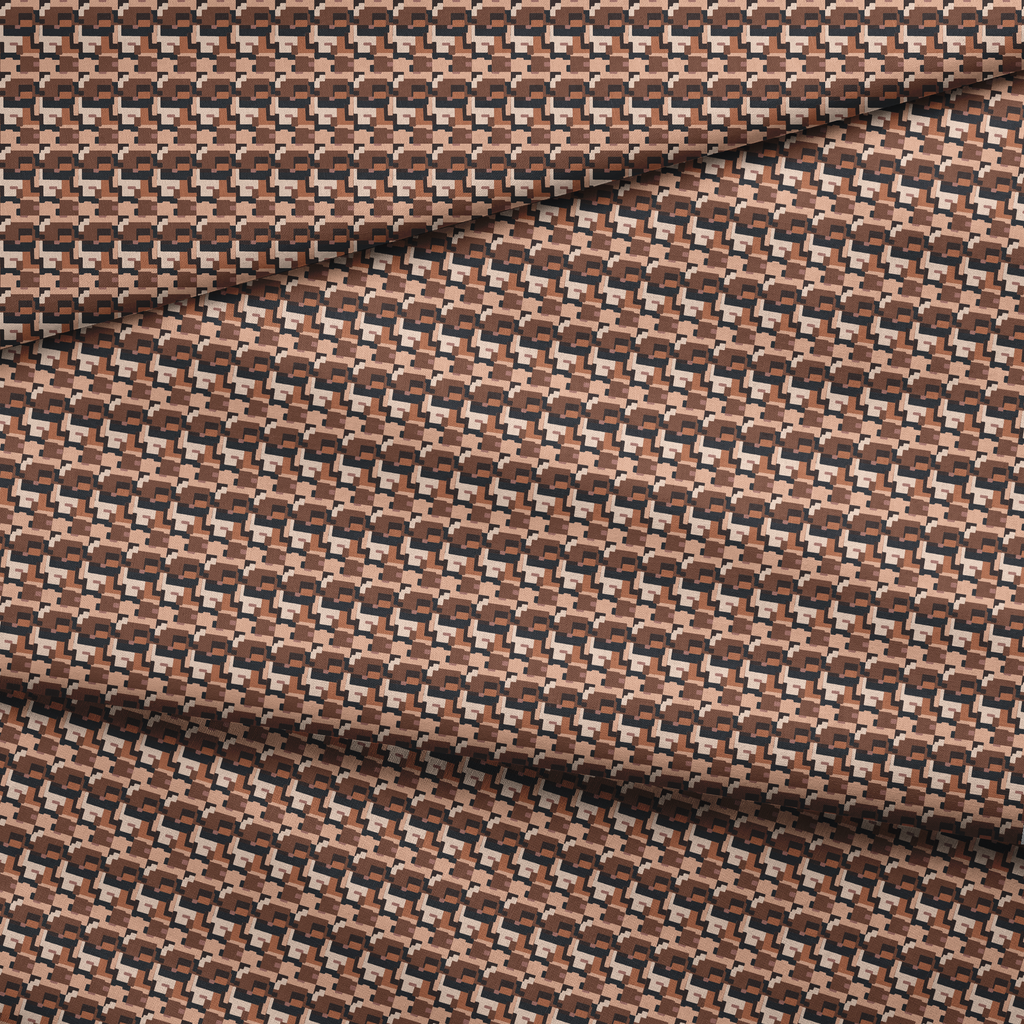 Retro pixelated geometric pattern in brown, beige, and tan earth tones with a digital block print aesthetic perfect for contemporary apparel and home decor projects.