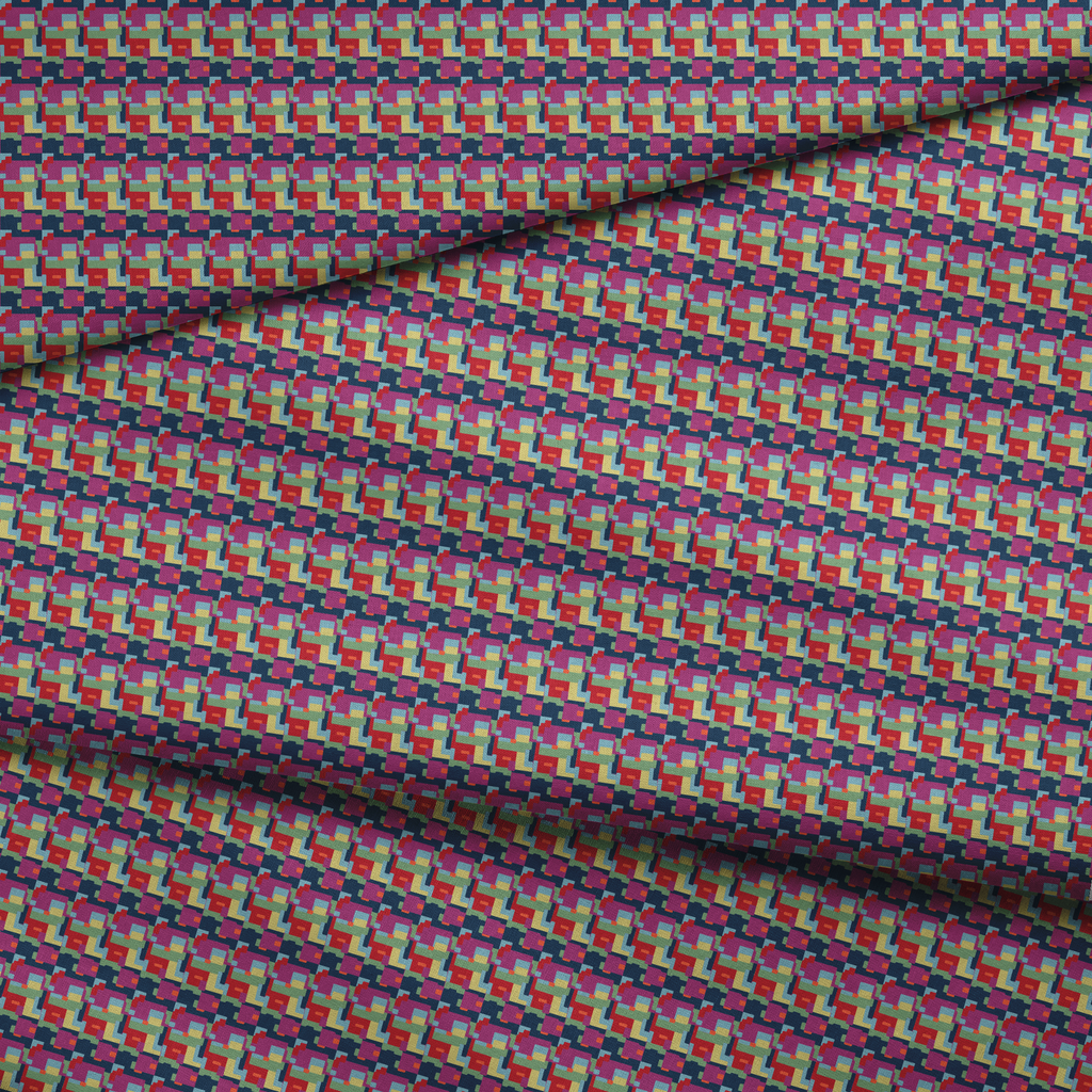 Vibrant geometric abstract pattern with interlocking colorful squares in pink, blue, yellow, green and red creating a bold contemporary tessellated design perfect for modern decor.
