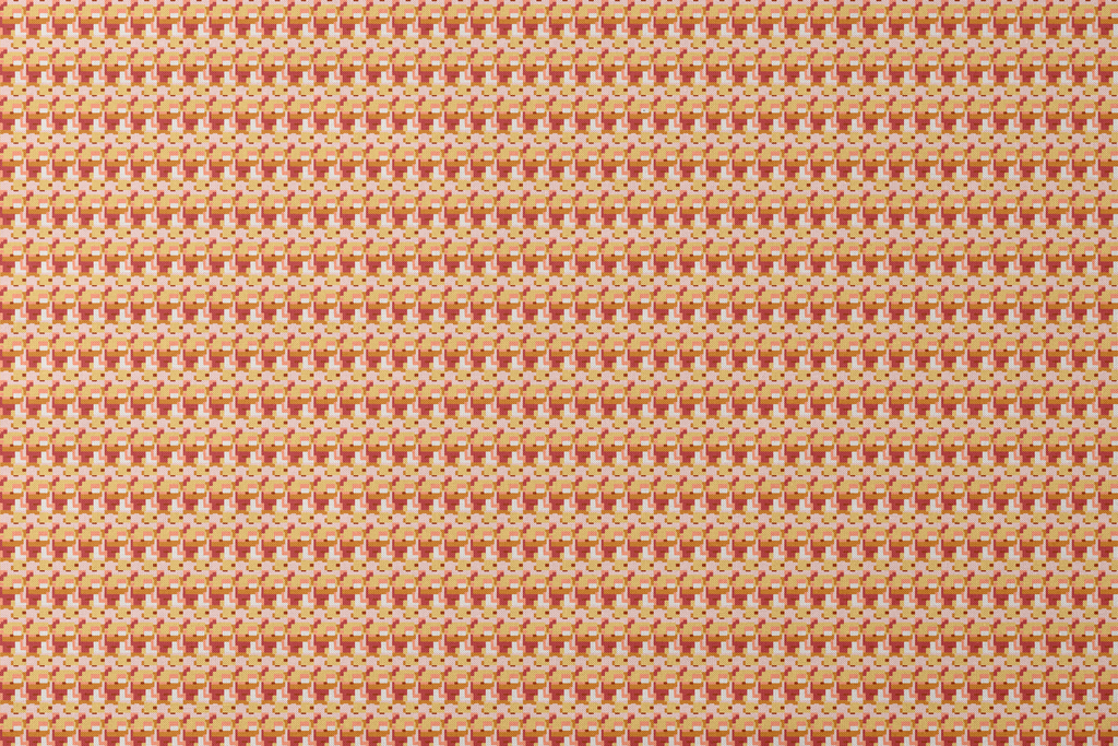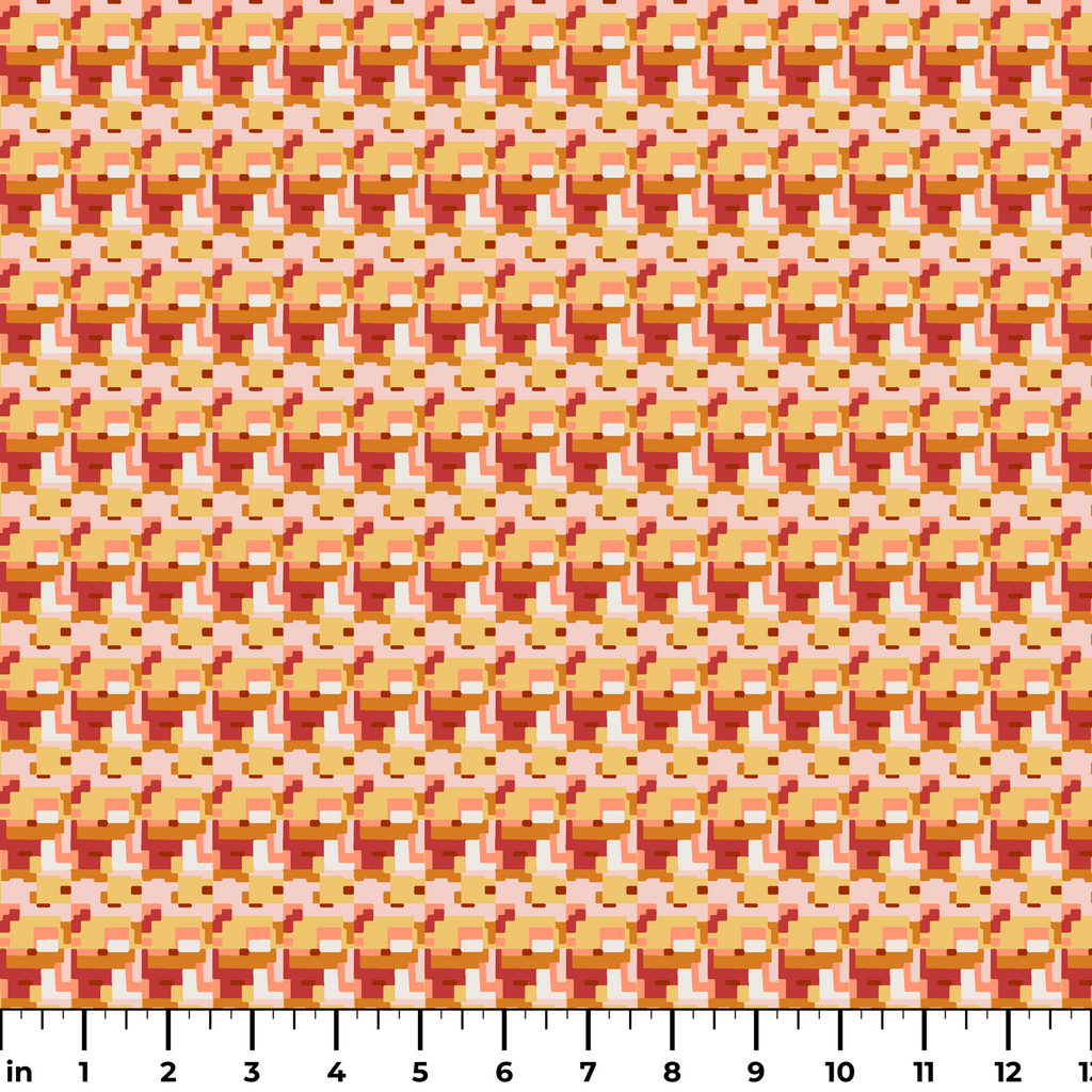 Retro geometric tessellation pattern in warm coral, orange, and yellow tones with southwestern folk art inspired motifs perfect for boho home decor and quilting projects.