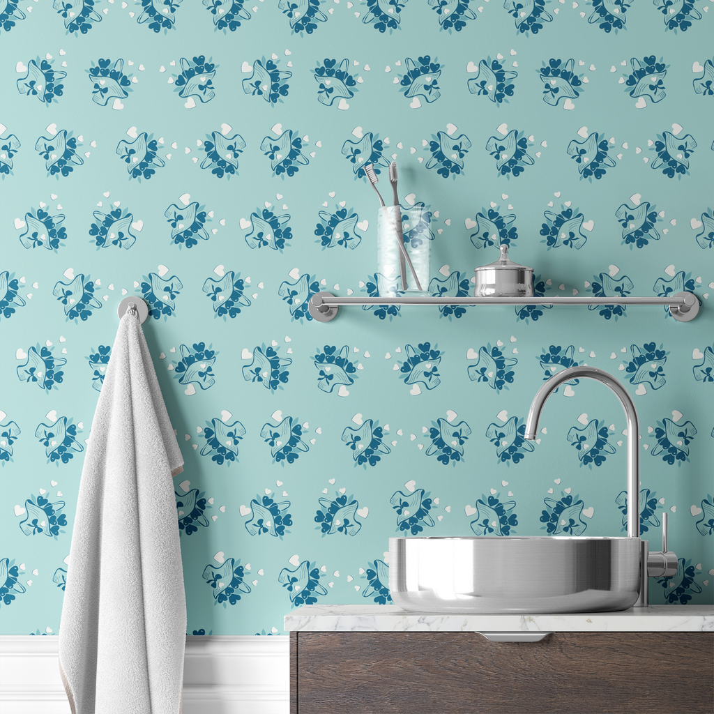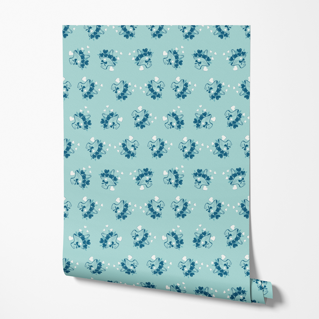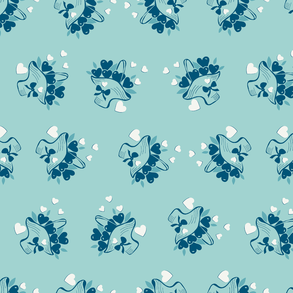 Delicate navy heart floral arrangements on a soft blue background create a romantic pattern perfect for any space.