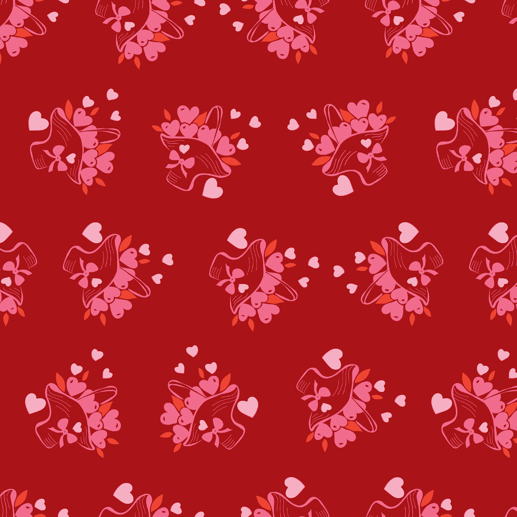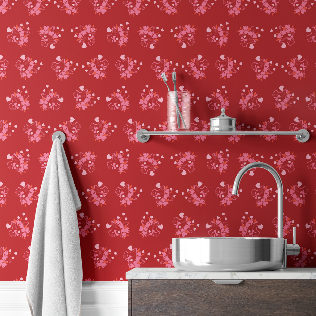 Delicate pink heart floral arrangements on a crimson background create a romantic pattern perfect for any space.