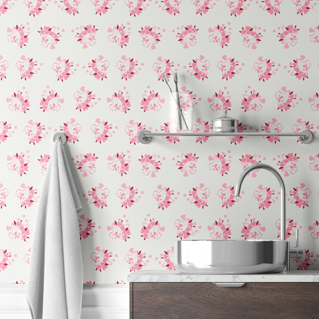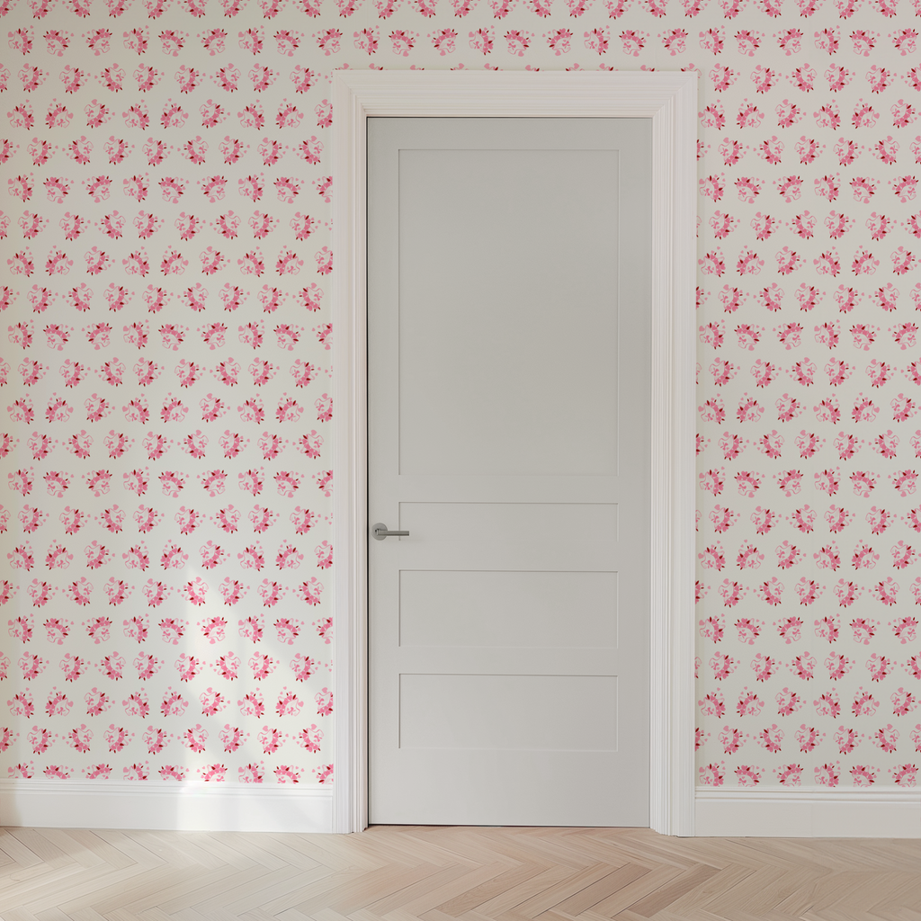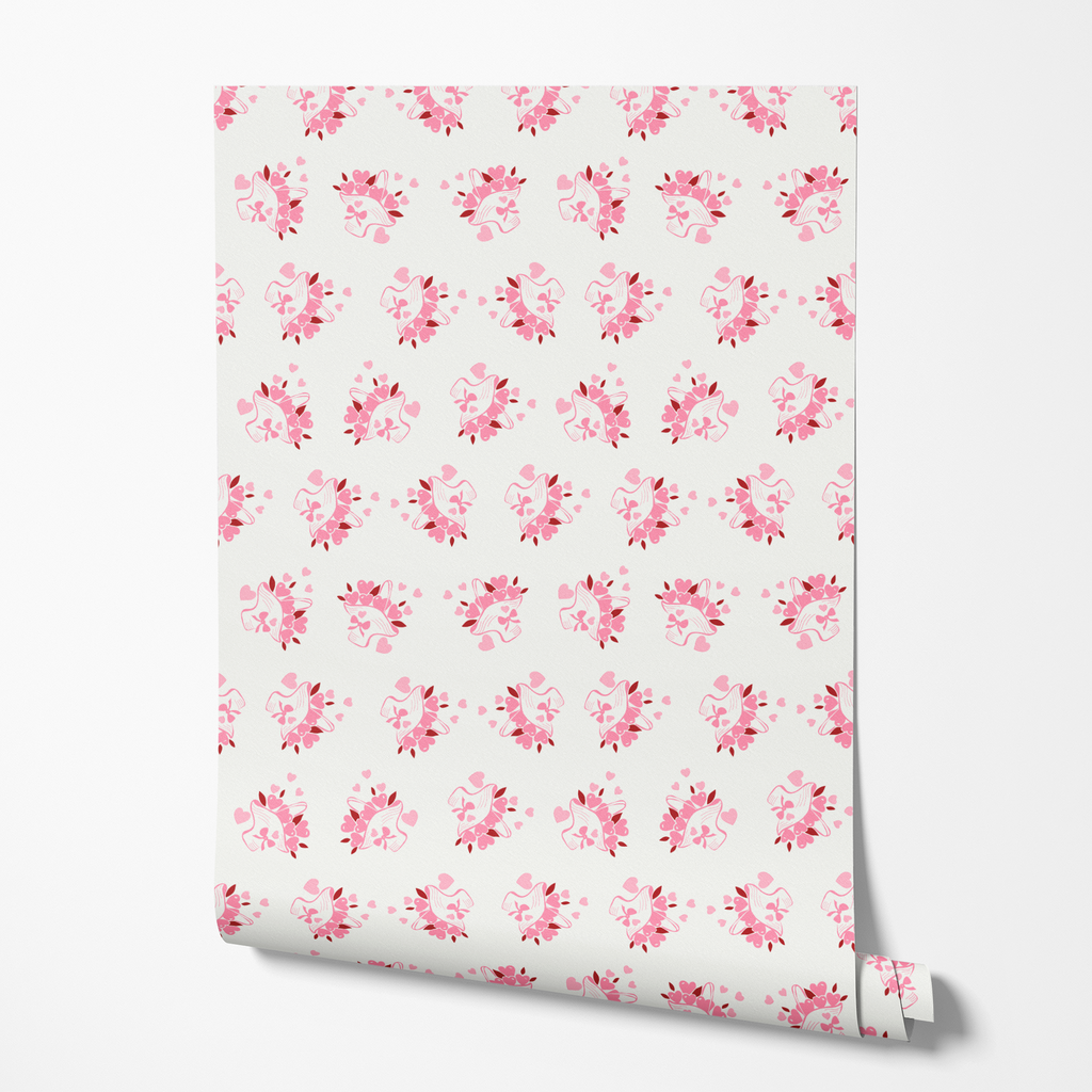 Delicate pink heart floral arrangements on a soft ivory background create a romantic pattern perfect for any space.