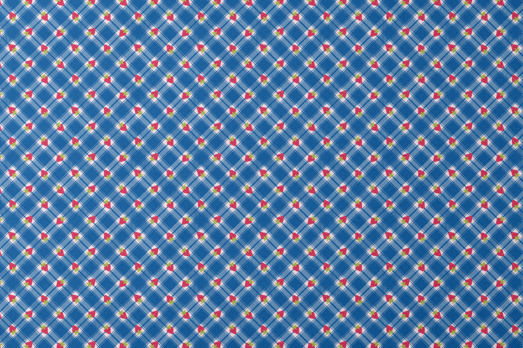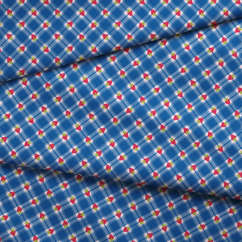 Playful and charming, this design showcases vibrant red strawberries with green leaves scattered across a cobalt blue plaid pattern. The textured blue crisscross design creates a picnic-blanket feel, while the dotted strawberries add a sweet, nostalgic touch. Perfect for kitchen accessories like aprons and tea towels, or bring a touch of summer to your quilting projects with this fruity, cheerful print.