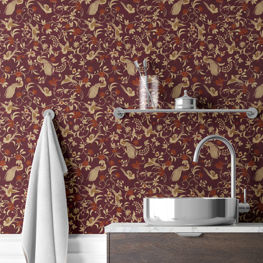 Luxurious burgundy fabric featuring elegant gold and rust floral patterns with graceful birds in a traditional Asian-inspired decorative style.