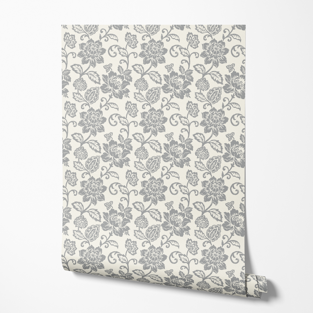 Sophisticated neutral floral featuring intricate peony blooms and leaves on a cream background, perfect for shabby chic and french country farmhouse inspired spaces.