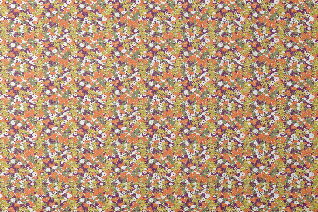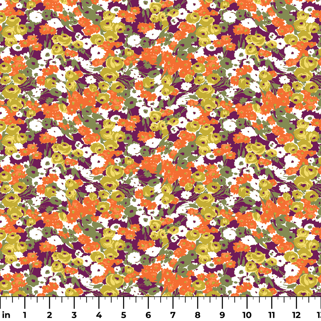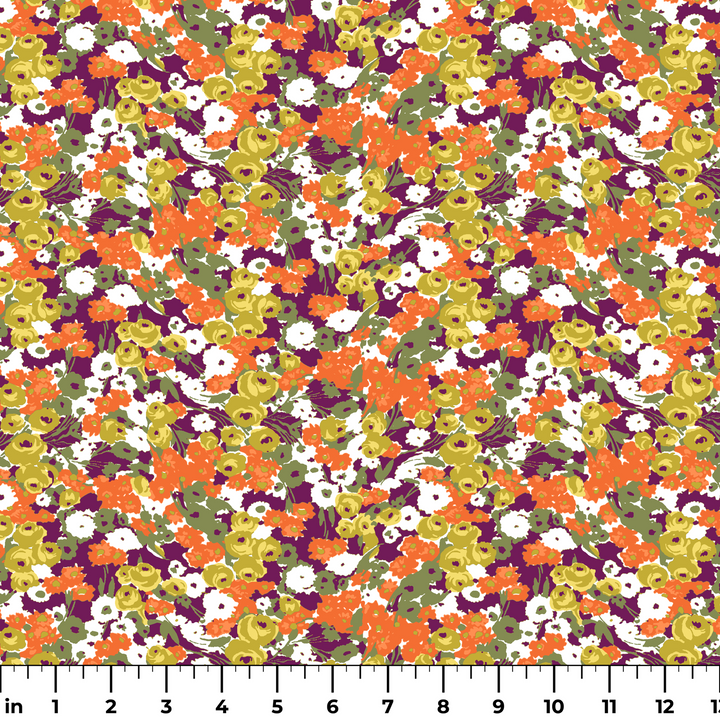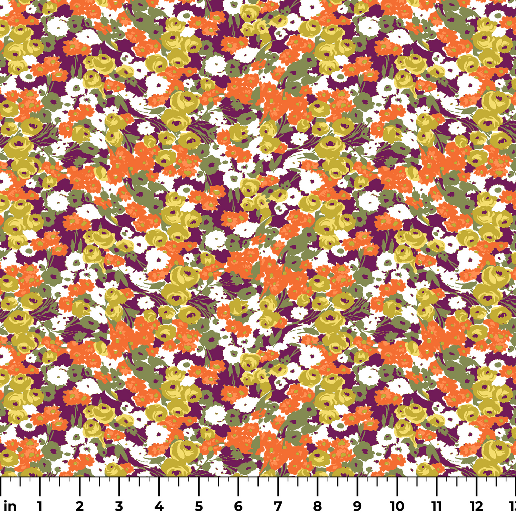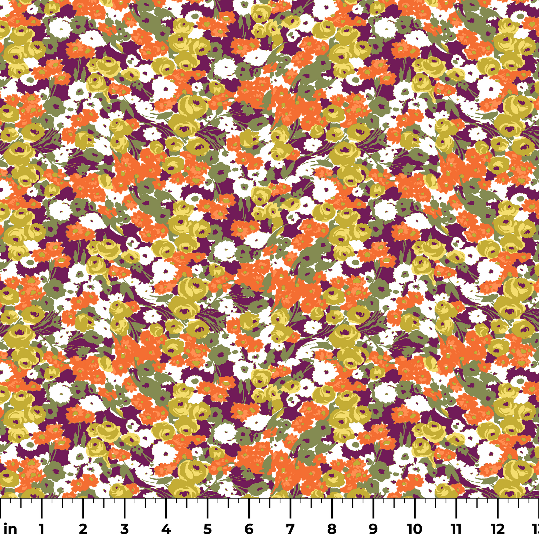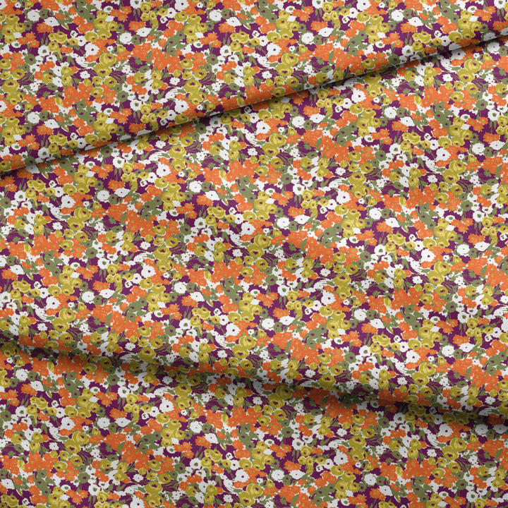 A vibrant floral pattern featuring orange, white, and yellow blooms with green foliage. This contemporary design offers a bold, colorful aesthetic perfect for sewing unique fashion pieces and home decor.