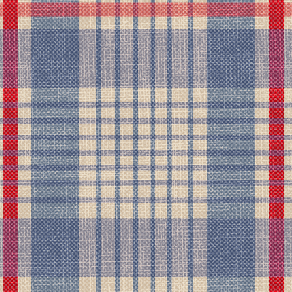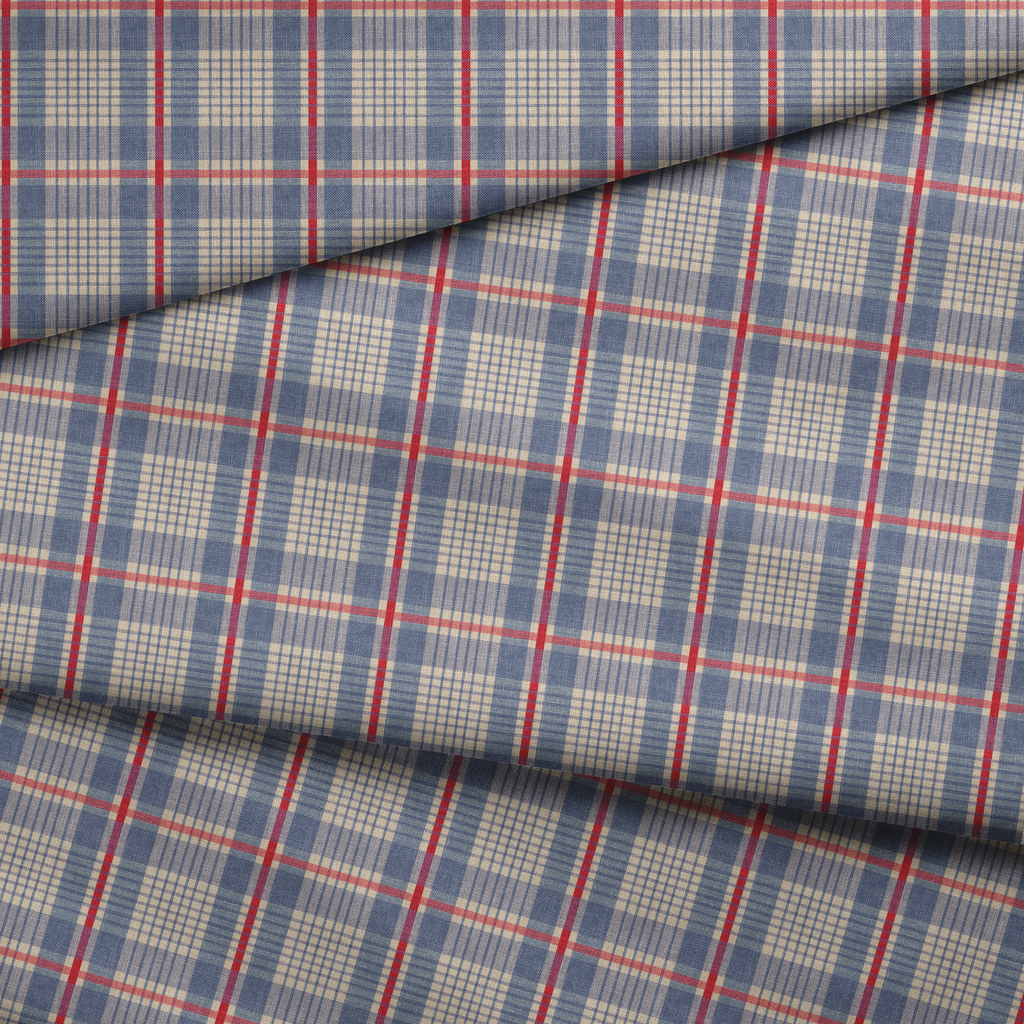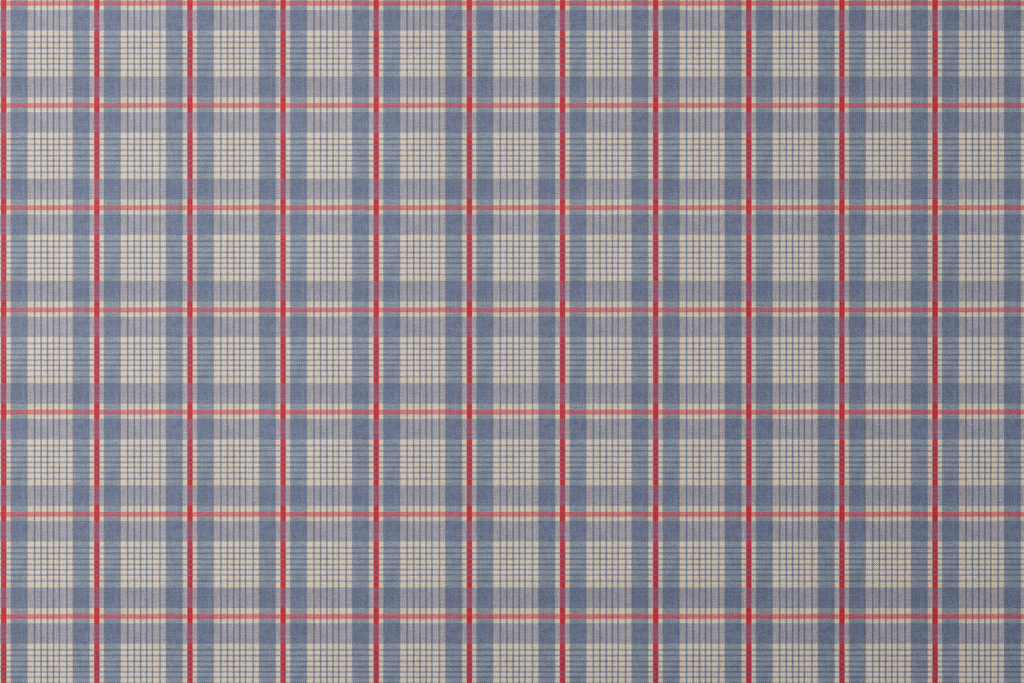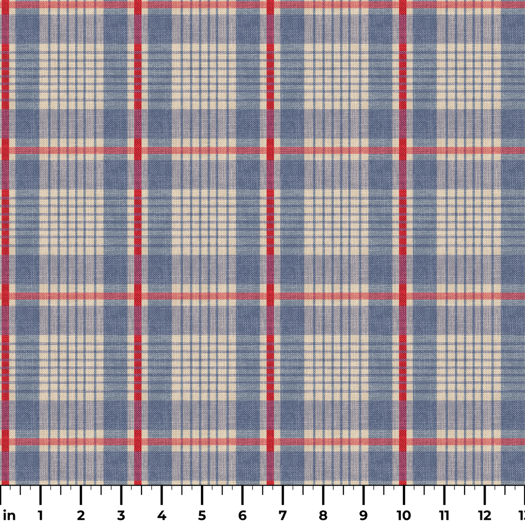 This classic blue, cream and red plaid fabric features a timeless woven pattern perfect for rustic home decor, country-style fashion, or traditional textiles with a cozy farmhouse feel.