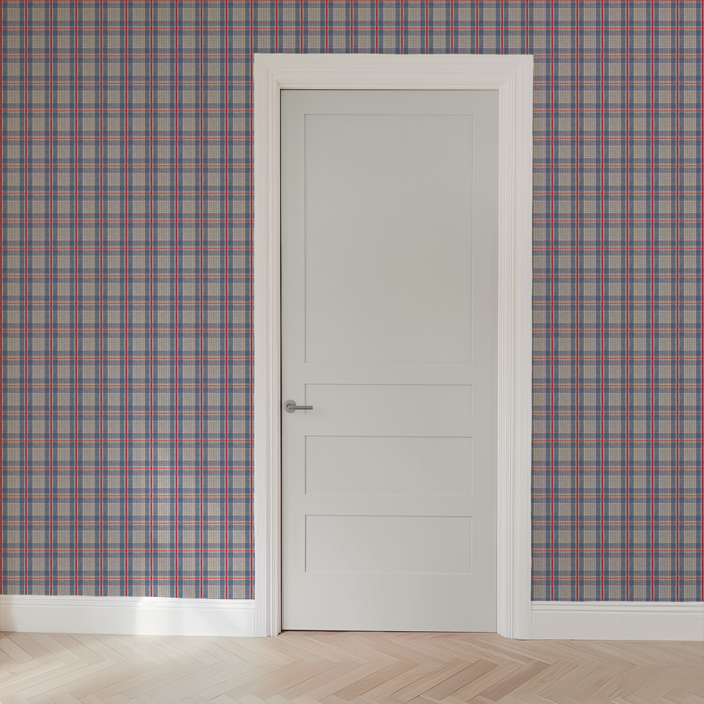 This classic blue, cream and red plaid fabric features a timeless woven pattern perfect for rustic home decor, country-style fashion, or traditional textiles with a cozy farmhouse feel.
