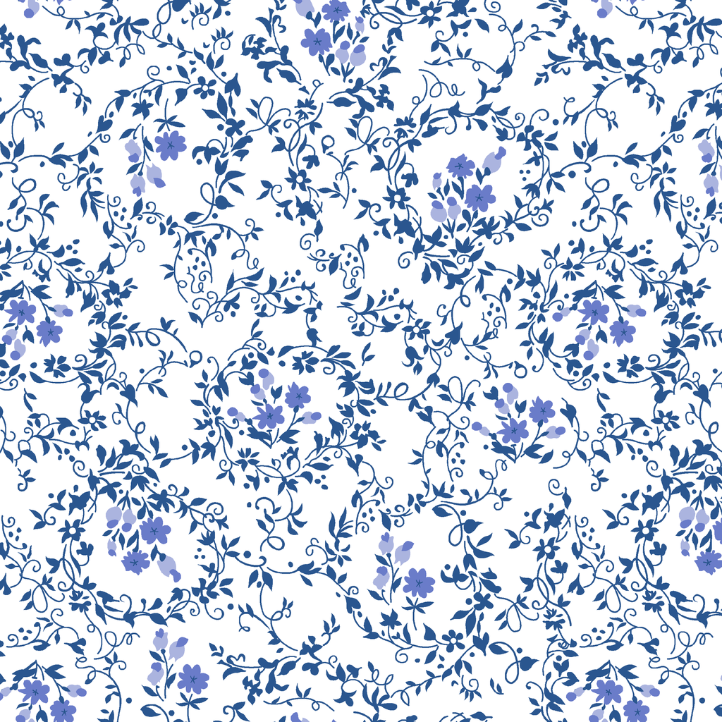 Charming french-country inspired blue and white floral features an intricate botanical pattern that is prefect for traditional and playful projects alike.