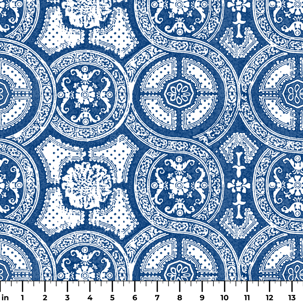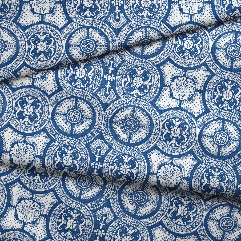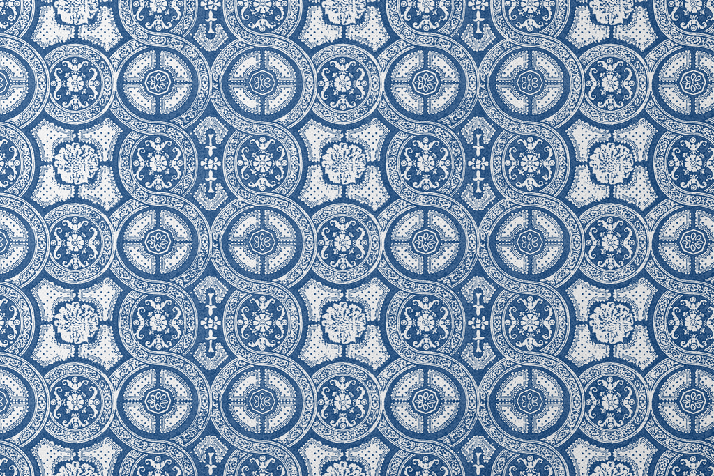 Elegant blue and white porcelain-inspired pattern featuring intricate medallions and floral motifs in a traditional chinoiserie style, perfect for classic home decor.